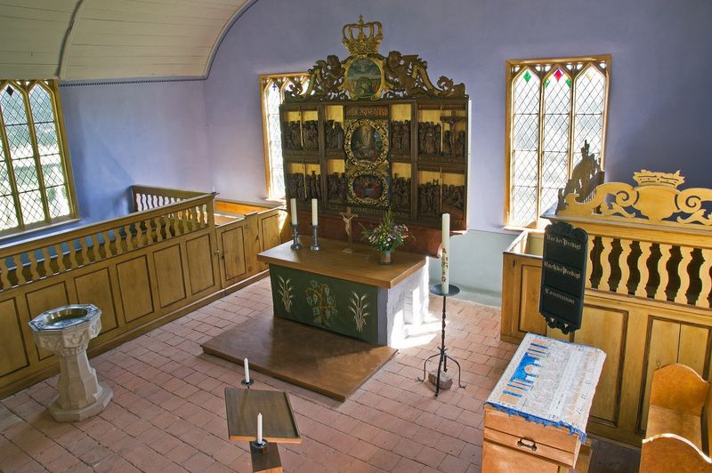 Die in Fachwerk errichtete Kirche entstand um 1750. Das einschiffige Langhaus besitzt einen verbretterten, nach Westen ausgerichteten Glockenturm aus Eichenholz mit vierseitigem Pyramidendach und ist zum Teil aus Material einer Vorgängerkirche erbaut. Der Innenraum weist eine flache hölzerne Tonnendecke auf. Der Altar, der Elemente der Gotik und des Barock aufweist, zeigt Darstellungen aus dem Leben Jesu Christi. Der Schnitzaltar mit zwölf Reliefs zur Mariengeschichte und Passion Christi wurde 1500 gefertigt, die Kanzel mit Schalldeckel, die ehemalige Patronatsloge, der Pastorenstuhl, das Gemeindegestühl und die Westempore um 1800. Das Geläut der Kirche besteht aus einer Glocke aus dem 15. Jahrhundert, ohne Schmuck und Inschrift. Am Balken daneben steht die Inschrift „Anno 1696 den 8. Octobris“.