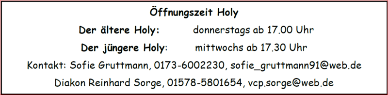 Etwa 10 - 15 Konfirmanden und Konfirmierte gehören zum jüngeren Holy, der sich wöchentlich nach dem Konfirmandenunterricht am Mittwoch seit Mai 2016 trifft. Auch in dieser Gruppe gehört das gemeinsame Kochen und miteinander Essen zum regelmäßigen Ablauf der Treffen, danach spielen wir oder arbeiten an einem Thema. Sehr beliebt sind die Filmnächte. Für den Sommer planen wir eine Wochenendfreizeit.