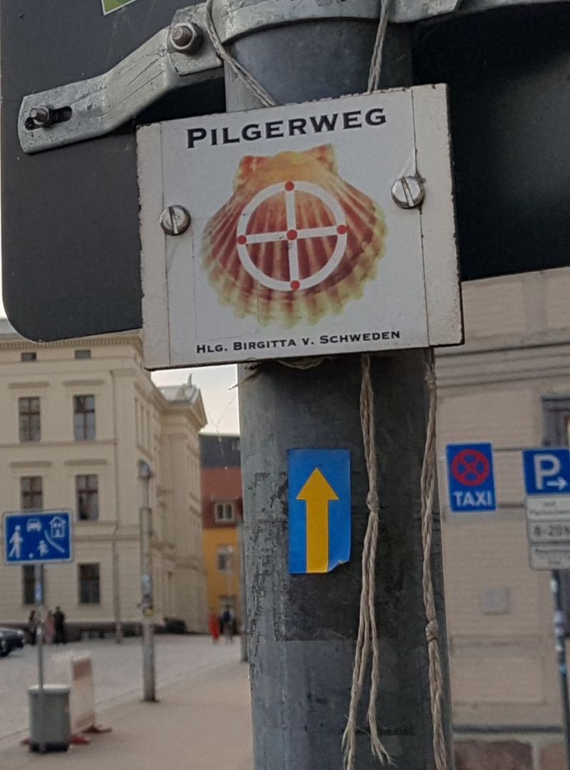 Pilgerwege orientierten sich immer entlang solcher Wallfahrts- und Kraftorte und an Klöstern. Schon in den 1980er Jahren wurde der Birgitta-Weg durch Initiative des Pilgerklosters Tempzin rekonstruiert. Durch Schwerin hindurch ist der Weg mit der Pilger-muschel und dem Birgitta-Kreuz ausgewiesen. Halten Sie mal zwischen Mueß, der Innenstadt und Neumühle die Augen offen. Vielleicht sehen Sie an einem Laternenpfahl oder Verkehrsschild ein Zeichen?