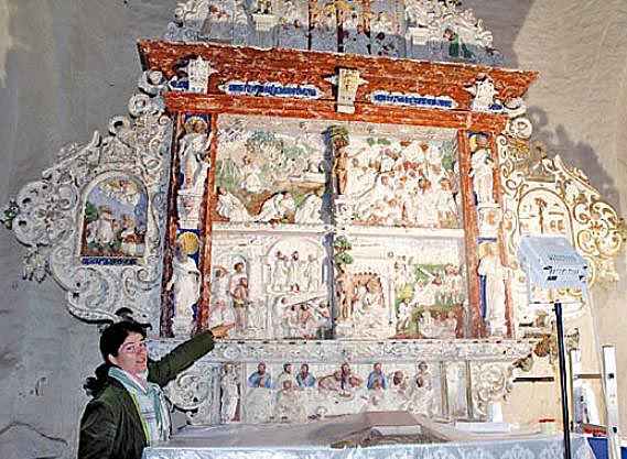 Für die Restaurierung der Altarwange im Hauptgeschoss benötigte sie sechs Wochen. Das Holzteil zeigt neben Früchten und Ornamenten die Geschichte von Mose und der Aufrichtung der Ehernen Schlange aus dem Alten Testament. Außerdem einen Pelikan, der seine Jungen durch sein eigenes Blut wieder zum Leben erweckt, ein weit verbreitetes Motiv in der christlichen Bildsprache, das zum Symbol für Jesus Christus und seinen Tod geworden ist. Auf dem Mittelschrein des „protestantischen Altares“ ist die Passionsgeschichte zu sehen, auf der Predella die Abendmahlszene, oben die Kreuzigung sowie darüber die Weihnachtsgeschichte. „Ein sehr lebendiger Altar, voller Details“, sagt Gemeindepastorin Antje Exner und verweist zum Beispiel auf die Figuren Adam und Eva und die vielen Engel, sie zeigt auf eine Uhr und einen Hund.