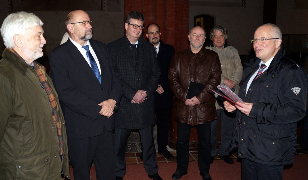 Am Freitag (19. Dezember) übergab Wirtschaftsminister Harry Glawe in der Greifswald St. Marienkirche eine Förderzusage in Höhe von 1,5 Millionen Euro an Oberbürgermeister Dr. Arthur König. Die Fördermittel stammen aus Finanzhilfen der Städtebauförderung und werden der Dach- sowie der vollständigen Hüllensanierung des Gotteshauses dienen. Anwesend bei der Übergabe waren neben Propst Gerd Panknin, Pastorin Dr. Ulrike Schäfer-Streckenbach und Pastor Dr. Bernd Magedanz auch Mitglieder der Evangelischen Kirchengemeinde St. Marien Greifswald, die Bauherrin der umfangreichen Sanierungsmaßnahme ist.