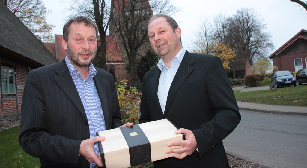 Propst Dr. Karl-Matthias Siegert, Wismar, bedankte sich jetzt bei dem Friedhofsmitarbeiter und Kirchenältesten. „Sie haben vor allem Mut bewiesen“, sagte der Propst und überreichte dem 46-Jährigen ein Präsent im Namen des Mecklenburgischen Kirchenkreises und der betroffenen Kirchengemeinden.