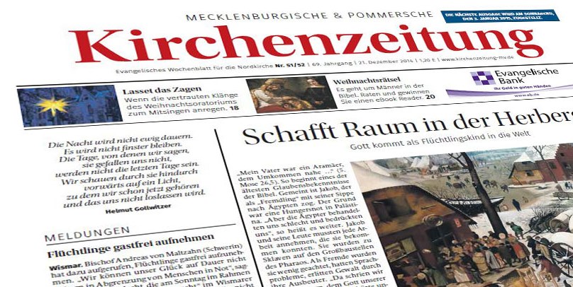 19.12.2014 · Schwerin/Kiel/Hamburg/Hannover. Die evangelischen Wochenzeitungen im Norden erscheinen am Sonntag (21. Dezember) erstmals in neuem Gewand: Die "Mecklenburgische & Pommersche Kirchenzeitung", die "Evangelische Zeitung" aus Hamburg und Schleswig-Holstein sowie die "Evangelische Zeitung" aus Hannover und Oldenburg kooperieren ab sofort und präsentieren sich mit optisch und inhaltlich neuem Konzept.