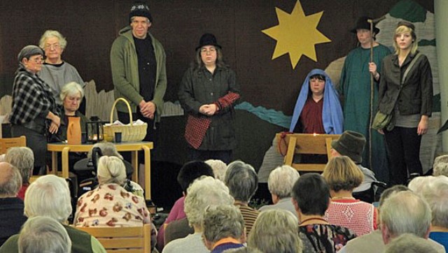 In dem Verkündigungsspiel lädt Franz von Assisi zerstrittene Menschen verschiedener Schichten und sozialer Herkunft auf einen Berg zu einer Krippe ein, wo sie das Weihnachtswunder erfahren. „Auf dem Berg erleben sie die Versöhnung“, so Christine Wawrsich. „Geben doch auch wir einander die Hand! Dem Christkind zuliebe“, heißt es in dem Verkündigungsspiel. „Dann wird es auch in unseren Herzen warm. Dann wird überall Frühling … mitten im Winter! Dann ist überall Weihnacht!“ Zu den 15 Darstellenden des Verkündigungsspiels zählen Bewohnerinnen und Bewohner des Evangelischen Altenzentrums sowie Mitarbeitende der Stiftung Stralsunder Schwesternheimathaus. Aufgeführt wird das Stück nur ein einziges Mal, am kommenden Dienstag. Alle Interessierten sind herzlich dazu eingeladen
