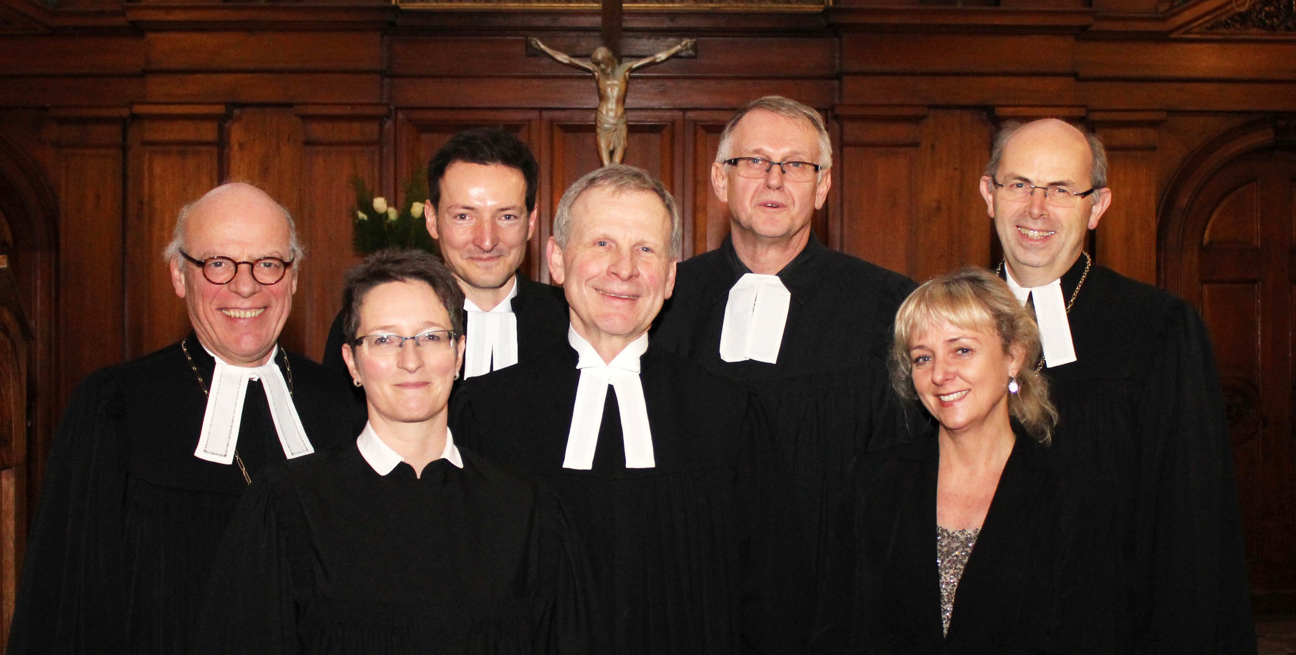 Landesbischof Gerhard Ulrich, Pastorin Karin Emersleben, Oberkirchenrat Dr. Daniel Mourkojannis, Pastor Dr. Mitchell Grell, Pastor Dr. Günter Wasserberg, Teamassistentin Beate Maurischaft und Bischofsvertreter Gothart Magaard. (v.l.n.r.)