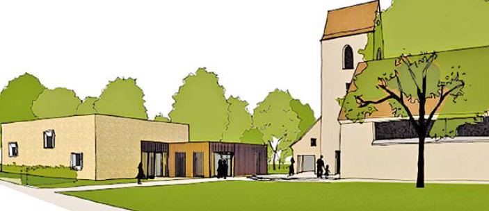 Der Neubau mit Chor- und Gemeinderaum und die denkmalgeschützte Kirche liegen an einem kleinen gemeinsamen Platz und sind von hier erschlossen. Der Baukörper des Neubaus reagiert in seiner Höhe auf die Kirche, bleibt niedriger in unmittelbarer Kirchennähe und wächst in Richtung Westen in die Höhe. Hierdurch entsteht ein auch in seiner Höhenentwicklung differenzierter Kirchplatz mit hoher Aufenthaltsqualität.