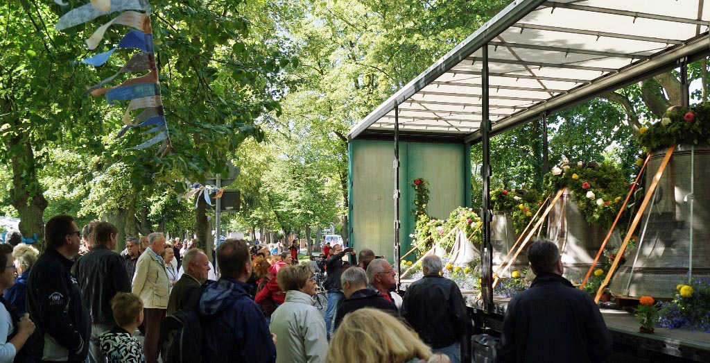 Angeführt wurde der Zug von einem Herold in historisierendem Kostüm. Er forderte die Anklamer lautstark auf, sich anzuschließen: „Heraus! Heraus! Bürger heraus! Seht sie, die Glocken von feiner Gestalt werden bald läuten mit aller Gewalt! Ob in schlechten oder guten Zeiten, sie sollen Gott zur Ehre läuten!“ Dem Herold folgten auf einem Traktor-Anhänger die Blechbläser sowie der große Sattelzug mit den festlich geschmückten Glocken. Hinterdrein radelten Hunderte Anklamer bis zur Parkallee am Stadtpark. Hier fand um 10.30 Uhr unter weiß-blauem Himmel zunächst ein Open-Air-Gottesdienst statt, an den sich unter dem Motto „750 Glücksmomente“ – bezugnehmend auf das Anklamer Stadtjubiläum in diesem Jahr – ein großes Gemeindefest mit Picknick und Live-Musik anschloss.