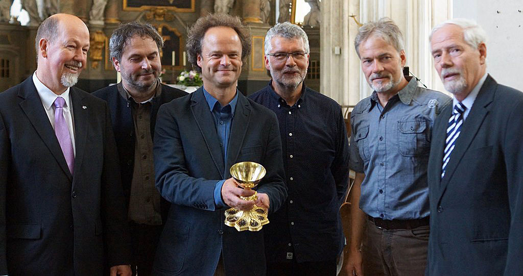 Allein konnte das Kuratorium der Rostocker Nikolaikirche, aus dessen Besitz der Kelch stammt, die dringend notwendige aber 8000 Euro teure Restaurierung nicht stemmen, so Marcus Mannewitz. „Ein Anfangskapital in Höhe von 800 Euro konnten wir aber bereitstellen.“ Zum Glück begeisterte sich Heiner Schumacher von der Evangelischen Kreditgenossenschaft eG (EKK) - von Kirchenbaurat Schwarz bei einer gemeinsamen Autofahrt angesprochen - sofort für das Projekt. „Wir als Kirchenbank erhalten hier Gelegenheit, ,Kirche in ihrem Innersten“ zu fördern“, sagt der Schweriner Regionaldirektor, dessen Bank 3000 Euro spendete.