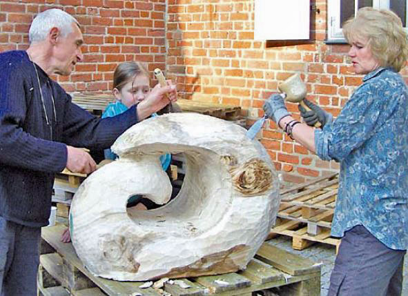 Man traf sich im Januar 2014 erstmalig zu Vorgesprächen, spielte miteinander, um sich kennenzulernen – und es passte. Schon im Februar ging es raus in den Burginnenhof, wo man das Holz gut stehen lassen kann – da war es noch sehr kalt. Aber „man arbeitet sich schnell warm, die Bewegung beim Holz bearbeiten geht durch den ganzen Körper“, sagt Doris Wehring.
