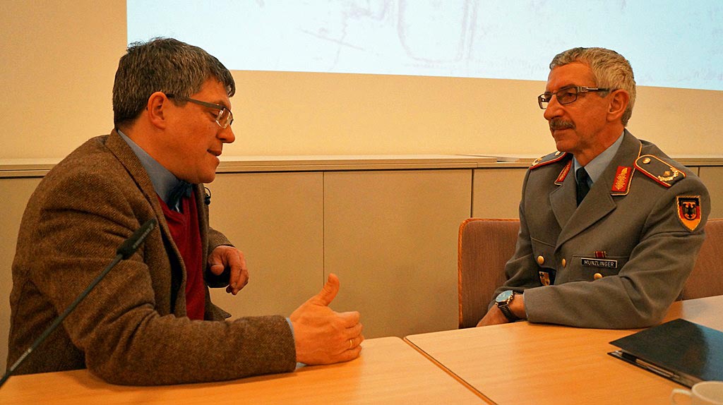 „Im Ziel sind wir uns einig“, meinte Christof Munzlinger, der sich zu seinem christlichen Glauben bekannte. Bezugnehmend auf Äußerungen des Bundespräsidenten, in denen dieser sich eine aktivere Rolle Deutschlands in der Welt gewünscht hatte, sagte der General: „Es ging Joachim Gauck um mehr Verantwortung für einen gerechten Frieden und nicht um mehr Schießen und Waffen.“ Verantwortung heiße demgemäß Handeln statt Zuschauen. Er empfahl den anwesenden Soldatinnen und Soldaten, sich die vollständigen Ausführungen des Bundespräsidenten im Internet durchzulesen. Das biblische Gebot „Du sollst nicht töten“, schließe mit ein, nicht zuzusehen, wenn getötet wird, so der General. Er zitierte Martin Luther, der gefordert habe, dem Nachbarn in allen Nöten beizustehen. „Wir müssen ungerechter Gewalt in den Arm fallen. In diesem Sinne sind Soldaten Friedensbringer“, sagte Christof Munzlinger.
