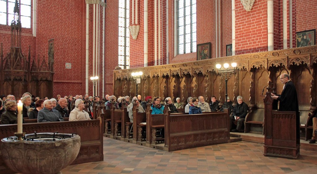 Der Schweriner Bischof Dr. Andreas von Maltzahn verwies im Schleswiger Dom auf den biblischen Predigtext "Gott hat uns nicht gegeben den Geist der Furcht, sondern der Kraft und der Liebe und der Besonnenheit". "Dieser Geist steht uns bei in den wichtigen Veränderungen, die vor uns liegen", so der Bischof. Er verwies auf die Energiewende und den Umgang mit Flüchtlingen. In dem Gottesdienst sprach auch die erste Rabbinerin Jerusalems, Ada Zavidov aus der reformierten jüdischen Gemeinde Kehilat Har El. Sie ist Gast im Kirchenkreis Schleswig-Flensburg, der mit der Har El-Gemeinde eine Partnerschaft hat unterhält.