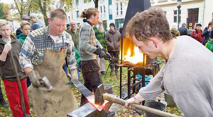 Das muss ich meinem Sohn erzählen“, sagt Margarete Stelzer, als sie am Reformationstag vor dem Greifswalder Dom steht. Umringt von rund 300 Besuchern haben ein Schmied und sein Lehrling gerade begonnen, ein Schwert zu einer Pflugschar umzuschmieden. Schwere Hämmer sausen auf die glühende Klinge nieder.