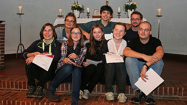 Erste Reihe v.l.: Antonia Berilla, Victoria Gorbatenko, Laura Gryga, Mareike Nehring, David Frank. Hinten: Wettbewerbssiegerin Kim Kamilla Jäger aus Greifswald, Sean Güttler und Christopher Türke