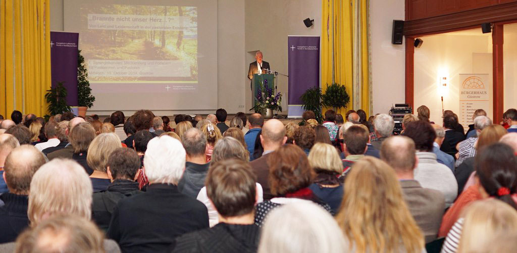 Rund 250 Pastorinnen und Pastoren trafen sich am Mittwoch (15. Oktober) zum ersten gemeinsamen Konvent im Sprengel Mecklenburg und Pommern. Unter dem Motto „Brannte nicht unser Herz…? Von Leid und Leidenschaft in der pastoralen Existenz“ tauschten sie sich im Güstrower Bürgerhaus darüber aus, was es heute bedeutet, Pastorin oder Pastor zu sein.