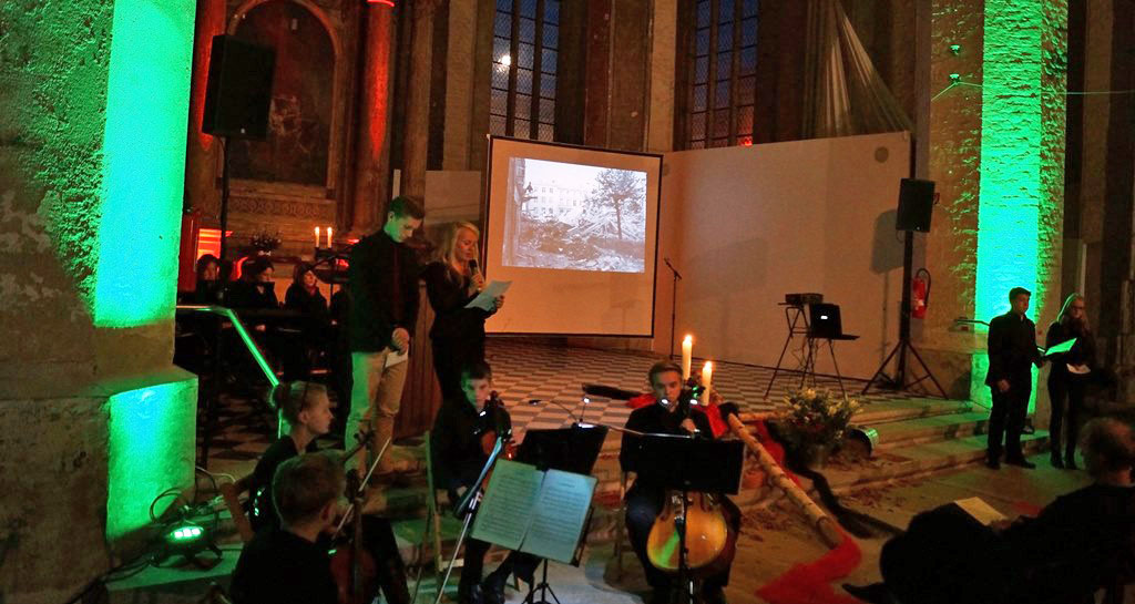 Zu Beginn des Friedensgebets schilderten Pastorin Annekatrin Steinig und Pastor Albrecht Mantei die Ereignisse des 6. Oktobers des Jahres 1944 aus der Sicht einer Augenzeugin. Am Ende des Berichts bezeichneten die Pastoren die heutige Erinnerungskultur als eine Form der Befreiung und zitierten ein Wort aus der jüdischen Tradition, in dem es heißt, dass Erinnerung das Geheimnis der Erlösung sei.