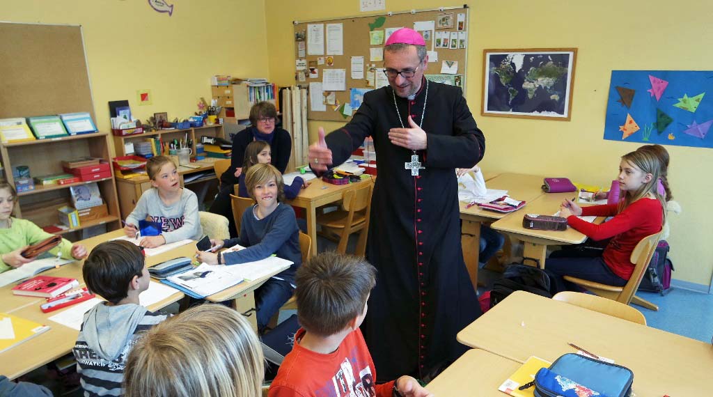 Im Anschluss besichtigte Heße die weiterführende Schule und traf sich mit den Sprechern der 24 gymnasialen und regionalen Schulklassen. Bei dem Gespräch beantwortete er persönliche Fragen und nahm auch Stellung zu schwierigen Themen. Einen großen Vertrauensverlust hätten der Skandal um sexuellen Missbrauch von Kindern in der Kirche und auch die Verschwendung von kirchlichen Geldern zur Folge gehabt. Diese Schattenseiten der Kirche seien beschämend. „Wir müssen glaubwürdig sein und das, was wir glauben, auch leben“, sagte er den Schülern. Die Kirche dürfe sich nicht in der zweiten Reihe verstecken. „Wir Christen haben die Aufgabe, uns in die Gesellschaft einzubringen.“ Wo das vor allem auch mit dem liebevollen Einsatz um Schwächere und Ausgegrenzte geschehe, dort werde den Menschen klar, wofür die Kirche stehe, so Heße.