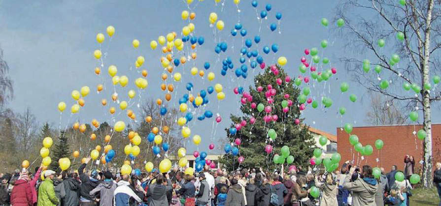 Auf der Festwiese stellten Bewohner, Schüler und Mitarbeiter das neue Logo nach und ließen 350 Luftballons in den Himmel steigen.