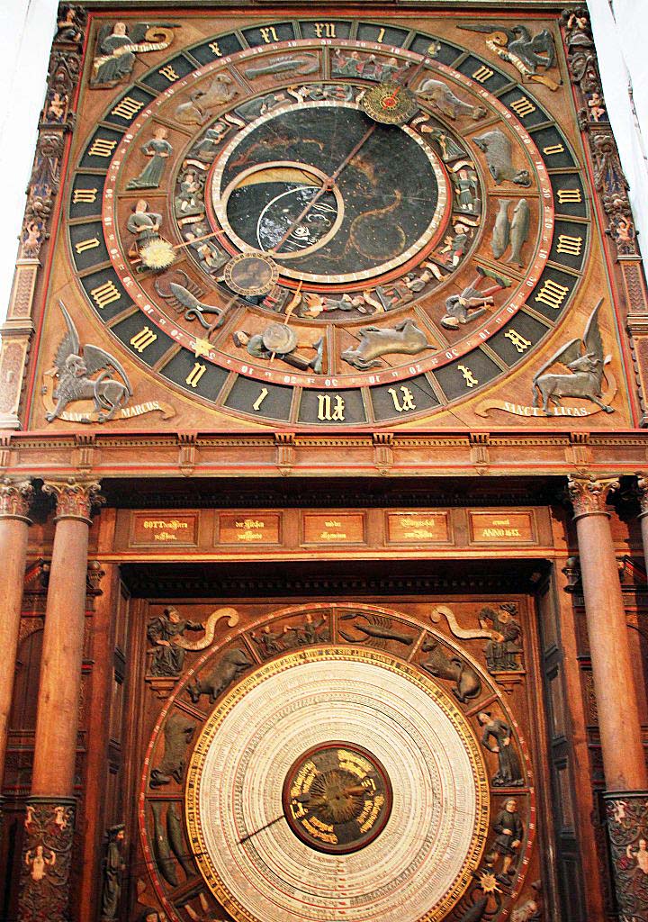 Die aus dem Jahr 1472 stammende astronomische Uhr hat fünf mechanische Werke, die täglich aufgezogen und gefettet werden müssen. Zwei Frauen und drei Männer machen dies ehrenamtlich. Der elf Meter hohe und rund fünf Meter breite Zeitmesser war von dem Danziger Meister Hans Düringer konstruiert, 1643 grunderneuert und zuletzt 1977 restauriert worden. Die Uhr funktioniert noch mit Originalteilen aus der Erbauerzeit und muss regelmäßig geprüft werden. Täglich zur Mittagszeit ziehen sechs Figuren an einem segnenden Christus vorbei, wobei der letzten, dem Verräter Judas, der Wiedereintritt ins Gehäuse verwehrt wird.