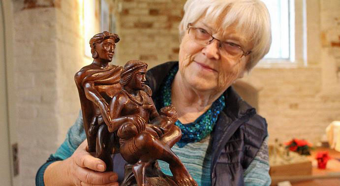 Heidemarie Wellmann mag diese Krippe besonders und will sie dann einem deutschlandweiten Publikum vorstellen. Die Skulptur sei einzigartig, findet die 71-jährige Gemeindepädagogin. Zum einen, weil der philippinische Künstler sie aus einem Stück Akazienholz fertigte und Maria und Josef wie die Urbevölkerung einer philippinischen Insel fast nur mit einem Lendenschurz bekleidet darstellt. Am meisten begeistere sie jedoch, wie Josef hinter Maria steht und "ihr den Rücken stärkt", sagt Wellmann. "Josef steht ja sonst meistens dumm rum."