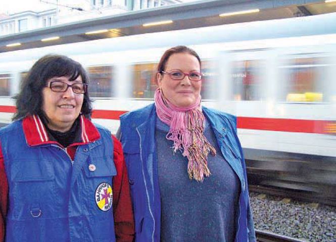 Seit fünf Jahren lebt die Hamburgerin in Schwerin und engagiert sich zwei bis drei Mal in der Woche für viereinhalb Stunden in der Bahnhofsmission. Das sie auch englisch, französisch und arabisch spricht, ist ein besonderer Glücksfall hier – auch wenn Ausländer auf dem kleinen Landeshauptstadt- Bahnhof mit nur vier Bahnsteigen nicht so häufig anzutreffen sind. Aber neulich zum Beispiel, als ein nur englisch sprechender Schwarzafrikaner seine Dokumentenmappe im Zug liegenlassen hatte, da konnte sie mit ihrer guten Sprachkenntnis schnell helfen: Seine Papiere wurden im Zug gefunden und mit dem nächsten zurückgeschickt. Ein gut endender Fall, an den sie sich noch lange erinnern wird.