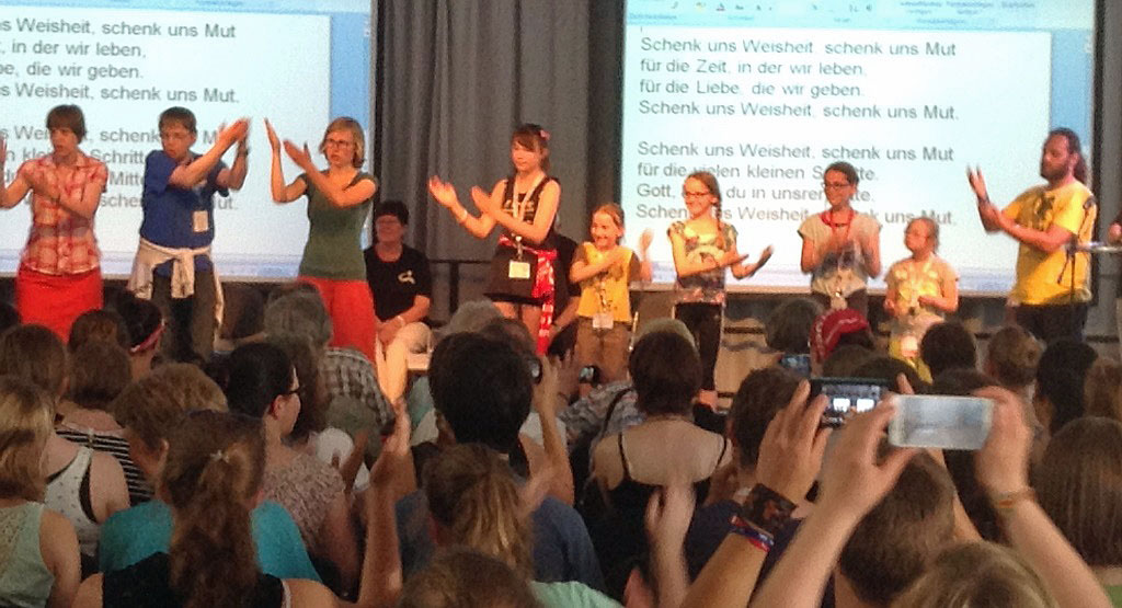 Am Ende wurde das eingeübte Lied gemeinsam gebärdet, wozu auch einige Telnehmende auf die Bühne kamen. Die Strophen wurden von kleineren Gruppen übernommen, der Refrain gemeinsam gestaltet. Zum Schluss gab es tosenden Applaus, auch der natürlich in Gebärdensprache.