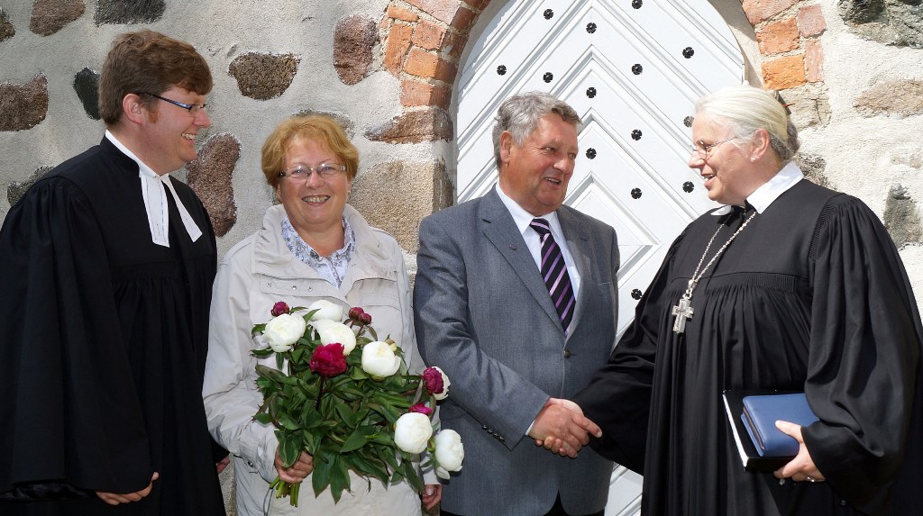 Die Verleihung des Ansgarkreuzes sei ein ganz besonderes Ereignis und eine deutlich sichtbare Anerkennung, so Helga Ruch in der vollbesetzten und festlich geschmückten Semlower Kirche. „Sie haben in schweren Zeiten dabei geholfen, dass die Gemeinde ihren Weg weitergehen konnte“, sagte die Pröpstin, während sie Manfred Himmelreich das Ansgarkreuz ansteckte und die dazugehörige Urkunde überreichte.