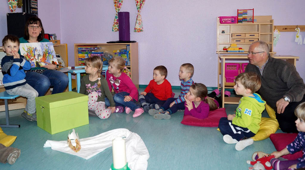 Eine weitere Station der Visitation war am Mittwoch die evangelische Kita „Krümelkiste“ in Lindenhof. Gerd Panknin und Raik Harder nahmen zunächst am Morgenkreis der großen Gruppe teil, in dem die Kinder einmal pro Woche von Jesus hören, und trafen sich anschließend mit Kita-Leiterin Dana Kunkel zum Gespräch. In der „Krümelkiste“ kümmern sich vier Mitarbeiterinnen wochentags von 6.30 bis 17 Uhr um 35 Kinder, die größtenteils aus den umliegenden Dörfern kommen. „Unser Augenmerk ist ganz besonders auf die Wertevermittlung gerichtet“, sagte Dana Kunkel. „Wir sehen das als elementaren Teil unseres evangelischen Profils.“