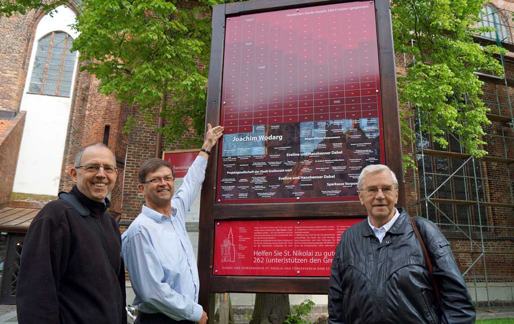 „Sämtliche Spenden gehen auf das Konto des Fördervereins, jeder Spender bekommt eine entsprechende Quittung“, so Jürgen Eichhorn. „Der Dom ist die steingewordene Seele und das Gesicht der Stadt Greifswald. Jeder Greifswalder ist eingeladen, Mitglied im Förderverein zu werden. Der Mitgliedsbeitrag von 20 Euro pro Jahr ist nur ein geringer Betrag angesichts der Tatsache, wieviel sich im Förderverein für den Dom bewegen lässt“, meint Jürgen Eichhorn. Matthias Gürtler berichtet, dass unter den Spendern vor allem Greifswalder seien, darunter auch bekannte Persönlichkeiten. Als Beispiel nennt er Kirchenmusikdirektor Jochen Modeß, dem der Domchor zu seinem 60. Geburtstag die 60. Stufe spendete.