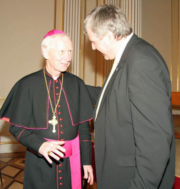 Landesbischof Gerhard Ulrich stellte in seiner Grußbotschaft insbesondere die „bescheidene, aber doch klare Weise“ heraus, mit der Weihbischof Norbert Werbs Dialoge mit der Gesellschaft führe: „Mich beeindruckt Ihre Haltung, Konflikten nicht aus dem Weg zu gehen, sondern sie in angemessener Weise in das Gespräch einzubringen.“ Ulrich erinnerte in diesem Zusammenhang an die Europäische Bischofssynode 1991, bei der Weihbischof Werbs seine sechs Fragen zur Verantwortung der katholischen Kirche in der modernen Gesellschaft vorgebracht hatte. Der Landesbischof weiter: „Die Grundlagen unseres gemeinsamen Glaubens führen uns zusammen und genauso das Bewusstsein für Aufgaben der Christen in einer Welt, die sich rasant wandelt und in der Werte auf Augenhöhe diskutiert und neu begründet werden müssen.“