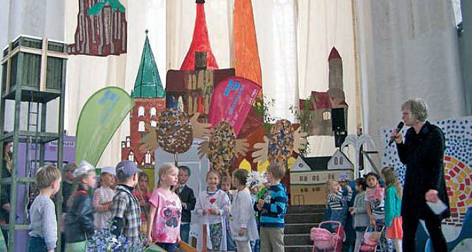 Mit Schürze, Kochmütze und -löffel, mit Handwerkszeug, verschiedenen Papp-Autos, mit Puppenwagen und anderen Utensilien kamen kleine Mädchen und Jungen auf die Bühne. Manche keck, andere verunsichert in die volle Nikolaikirche guckend, viele mal schnell zu den Eltern hin winkend. Rund 30 Kinder aus den Kindertagesstätten in Trägerschaft der Stadtmission stellten die vielen Berufe dar, die es in den verschiedenen Arbeitsbereichen bei der Diakonie Stadtmission Rostock heute gibt.
