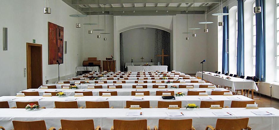 Blick in den noch leeren Tagungssaal in Züssow - hier treffen sich am Sonnabend die pommerschen Synodalen zu ihrer 10. Sitzung.