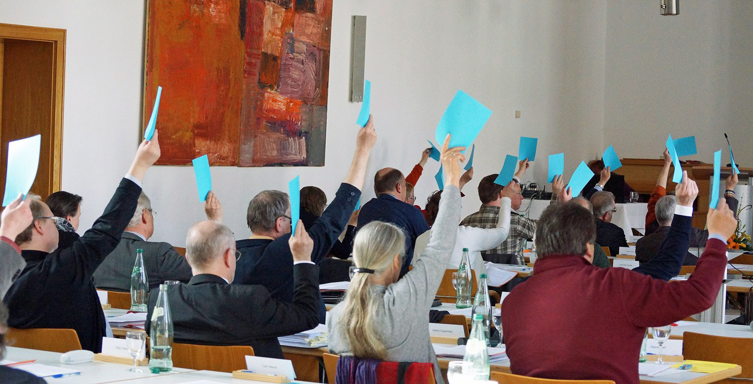 Pastor Matthias Bartels führte in die Plenumsphase der Tagung ein. Die Ortsgemeinde sei ein schlafender Riese, bezog er sich auf einen Aufsatz von Prof. Gerhard Wegner, Leiter des Sozialwissenschaftlichen Instituts der EKD. Diese Formulierung treffe genau unsere Situation, so der Pastor, und führe zu den Fragen: Wo liegen unsere Potentiale? Was kann geweckt werden? Was kann neu belebt werden? Vor der Beschlussfassung bildeten die Synodalen vier Arbeitsgruppen, deren Themen sich aus den Eckpunkten der Landessynode ableiteten: Gottesdienst und missionarische Grundorientierung, Kirche mit Anderen, Kirchengemeinden und ihre Gebäude sowie Mitarbeitende und Diakonisches Handeln. In den Gruppen wurden zahlreiche Schwerpunkte, Denkanstöße und Vorschläge zusammengetragen. Dazu zählten beispielsweise die Weiterentwicklung der Vielfalt der Gottesdienstformen, die Sicherung der Regelmäßigkeit der gemeindlichen Angebote und die Umsetzung flexibler, kleiner Lösungen für die Sanierung kirchlicher Gebäude. Im Anschluss an die Zusammenfassung und Diskussion der Ergebnisse aus den vier Arbeitsgruppen beauftragte die Synode einen Ausschuss damit, aus den Ergebnissen einen Beschlussvorschlag zu formulieren, über den auf der nächsten Synode abgestimmt wird.