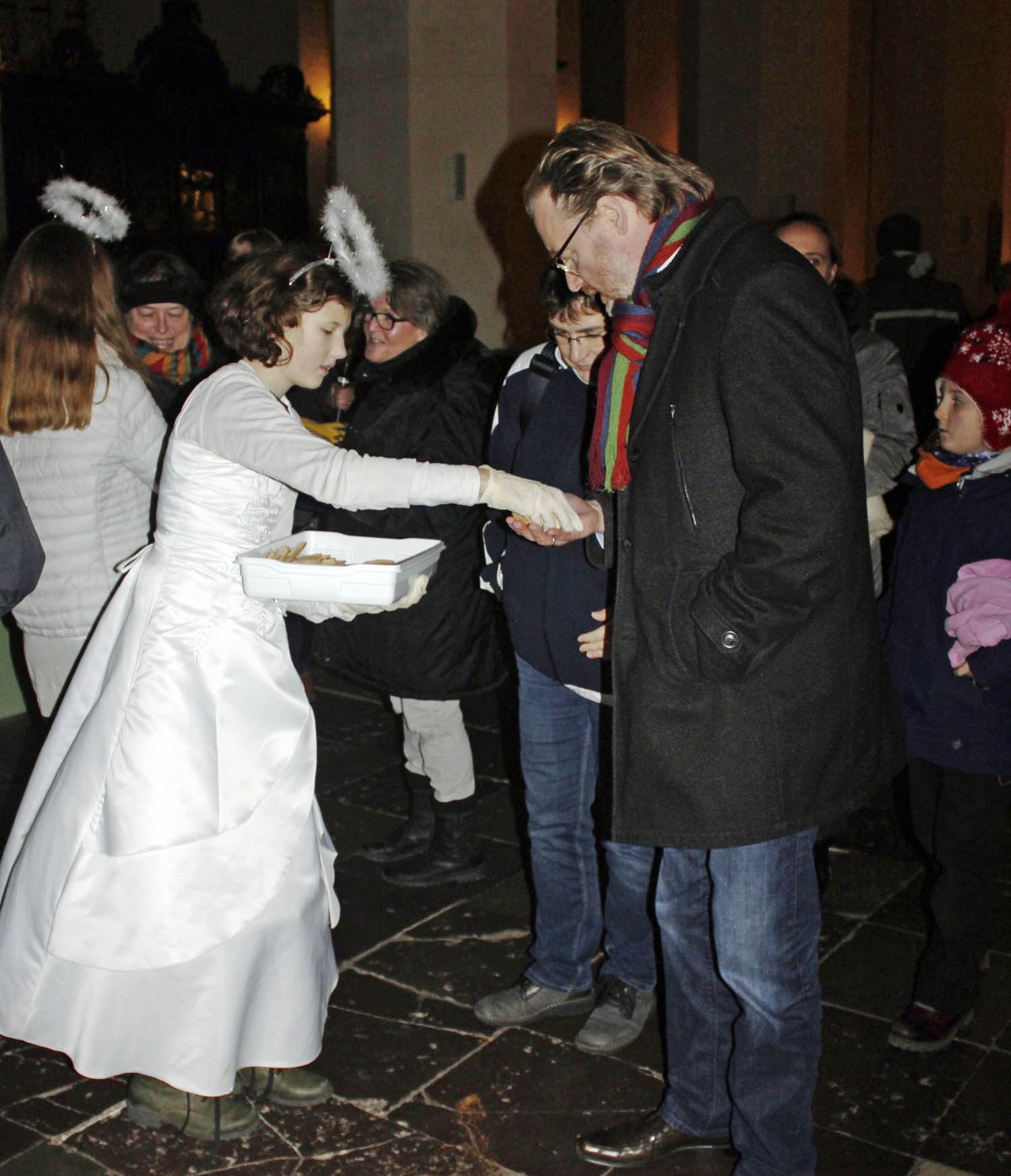 Um Engel ging es auch in den Liedern und der Lesung im Gottesdienst. Am Ende verteilten als Engel verkleidete Schülerinnen selbstgebackene Engel-Kekse. Schulleiter Ingo Schwabe erzählt: „Das Bonhoeffer-Lied ‚Von guten Mächten wunderbar geborgen‘ war ein besonderer Wunsch unserer Schüler für diesen Gottesdienst. Hintergrund dazu ist, dass die Klassen 9-11 dieses Jahr in Auschwitz waren und wir in diesem Rahmen auch das Lied behandelt haben. Das Lied und der Hintergrund haben sie sehr berührt.“