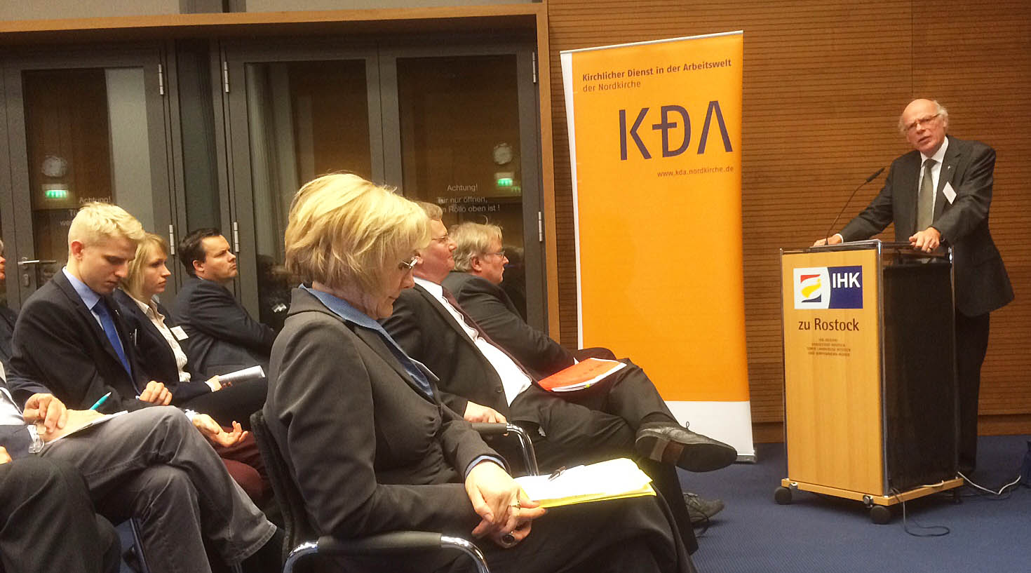 In der Rostocker Industrie- und Handelskammer (IHK) hatten sich zum Thema „Christliche Seefahrt - zwischen Kostendruck, Konkurrenz und Menschenrechten" rund 100 Gäste versammelt. Kooperationspartner war die Deutsche Seemannsmission e.V. Rostock, die vor 25 Jahren, am 31. Januar 1991, in der Nikolaikirche zu Rostock gegründet wurde.
