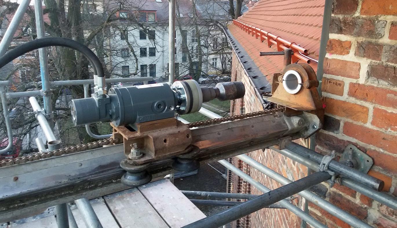 Bei klirrender Kälte hat die Firma SHB aus Wismar am Dienstag (5. Januar) am Ostgiebel des Greifswalder Doms St. Nikolai das Bohrgerät in Position gebracht. In millimetergenauer Arbeit werden insgesamt vier Zuganker vom Ostgiebel aus in Ost-West-Richtung in die Längswände zwischen dem Mittelschiff und den Seitenschiffen gebohrt. Die exakte Lage der Bohrung und der eingebrachten Ankerstangen mit einer Länge von jeweils 2,5 Metern muss engmaschig durch Messgeräte kontrolliert werden. Die Zuganker sollen den Chorbereich des Doms statisch stabilisieren und weitere Rissbildungen verhindern. Die Risse im nördlichen und südlichen Seitenschiff waren vor Weihnachten mit Gewindestangen „vernadelt“ und mit Spezialmörtel verpresst worden. Es sei ein großes Glück, dass diese Arbeiten vor Frosteinbruch abgeschlossen werden konnten, so Dombaukoordinator Stefan Scholz. „Das ist ein sehr wichtiger weiterer Schritt im Rahmen des von Statik-Fachleuten entwickelten Gesamtkonzepts für die Domsanierung.“