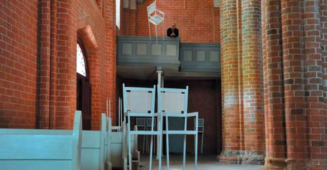 Bald wurde auch sichtbar, was es mit den Holzlatten auf sich hat: 40 sehr hohe, aber leicht zerbrechliche Stühle, alle mit einer Sitzfläche aus Pergamentpapier versehen, sind nun im Kirchenraum verteilt. Sogar hoch oben unter dem Gewölbe des Chores ist ein Stuhl in einer Luke so befestigt, als ob er gleich herabstürzen würde. „Er stößt die Gewaltigen vom Stuhl und erhebt die Niedrigen“ – diese Zeile aus dem Magnificat hatte m. u. kepno. zu den Installationen inspiriert. Während manche erwachsenen Besucher erst eine Interpretationshilfe brauchten, hatten Gruppen aus den Kindergärten oder dem Hort, so erzählt er, kaum Verstehensprobleme. Ergänzend zu den Stühlen hat der Künstler die vergangenen vier Wochen mehrere abstrakte Tafelbilder in einer kraftaufwendigen Schabetechnik zum Thema für die Nischen im Chorraum geschaffen.