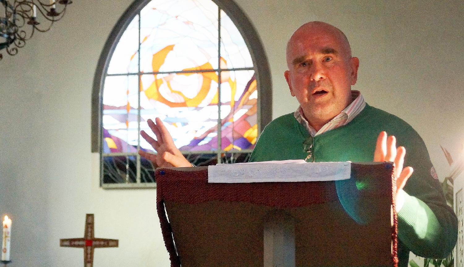 Die Kirche steht etwas abseits der weitläufigen Ortsanlagen von Bauer und Wehrland auf einer Anhöhe unweit des Peenestroms im Hinterland der Insel Usedom. Dicht gedrängt lauschten die Besuchenden in der vollbesetzten Kirche den Worten von Pastor Reinhard Kuhl, der zunächst eine von Licht- und Klangeffekten begleitete Andacht hielt, bevor er in einem Vortrag über das neue Chorfenster der Kirche sprach, das von Glasdesigner Ralf-Udo Slama gestaltet wurde.