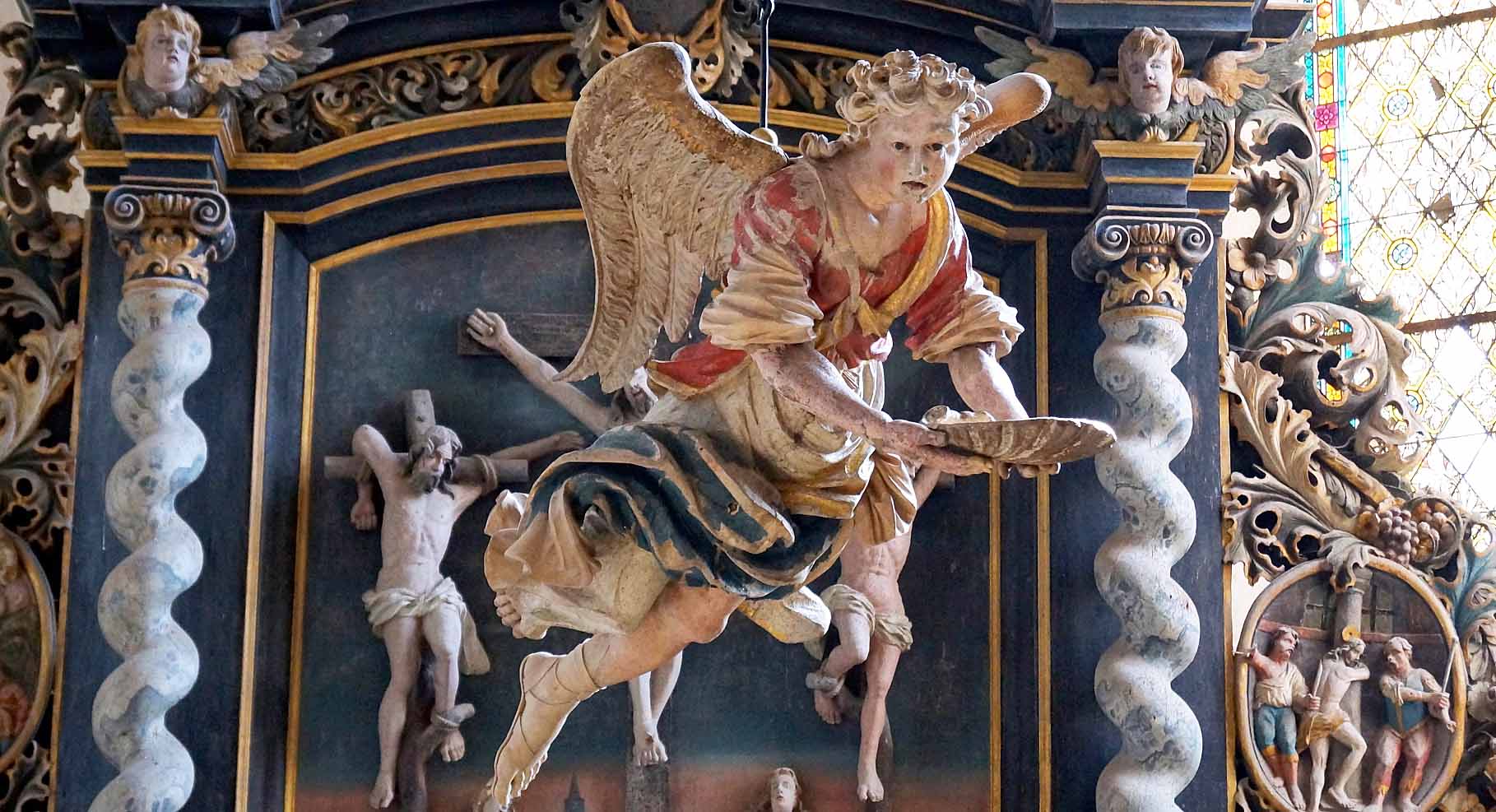 Der restaurierte Taufengel aus dem Jahr 1724 in die Kirche Groß Mohrdorf.