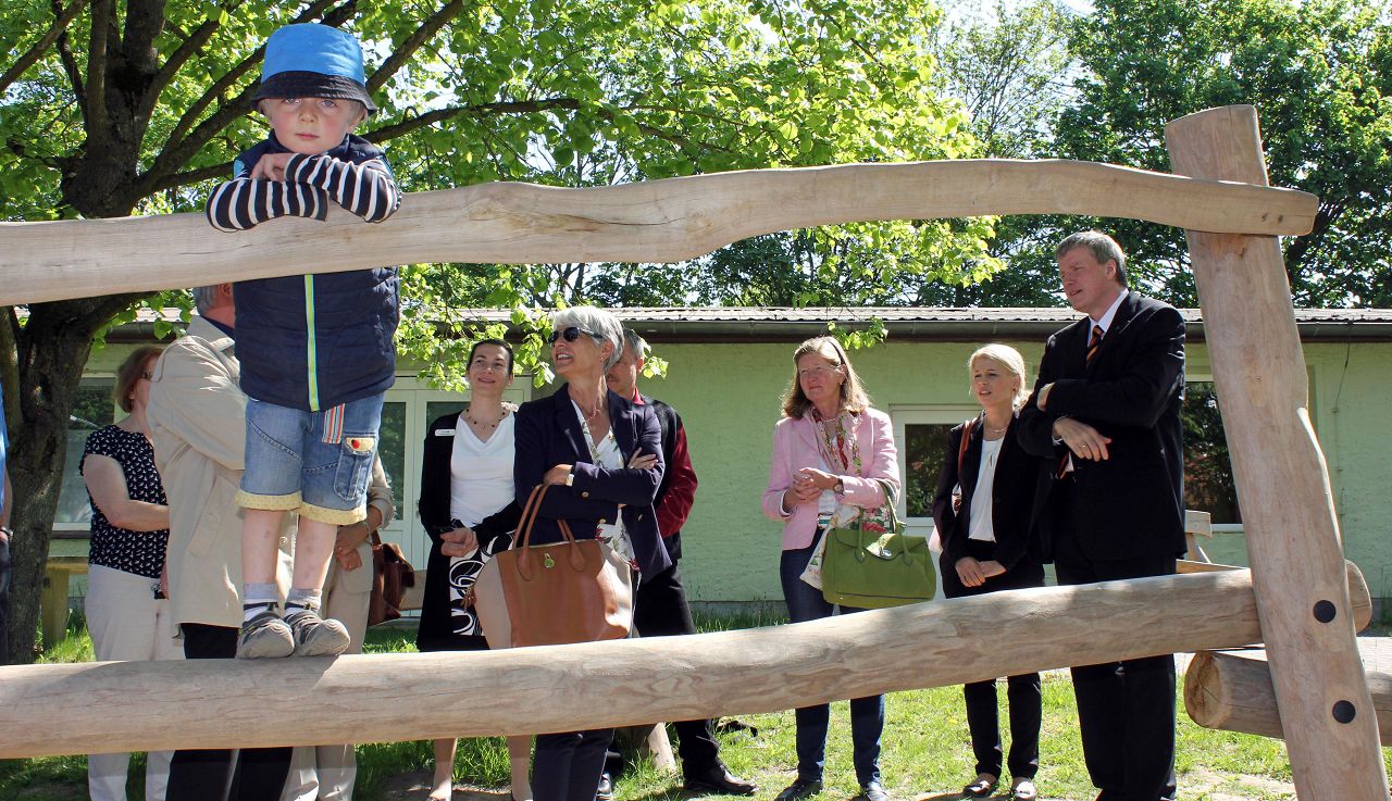 Einfach cool findet der fünfjährige Friedrich den neuen Spielplatz in Groß Lüsewitz. Das freute Ministerin Uta-Maria Kuder (M.), Stiftungsvorsitzende Bettina von Wahl (3.v.l.) und Bischof Andreas v. Maltzahn (r.) bei ihrem Besuch in der Gemeinde Sanitz.