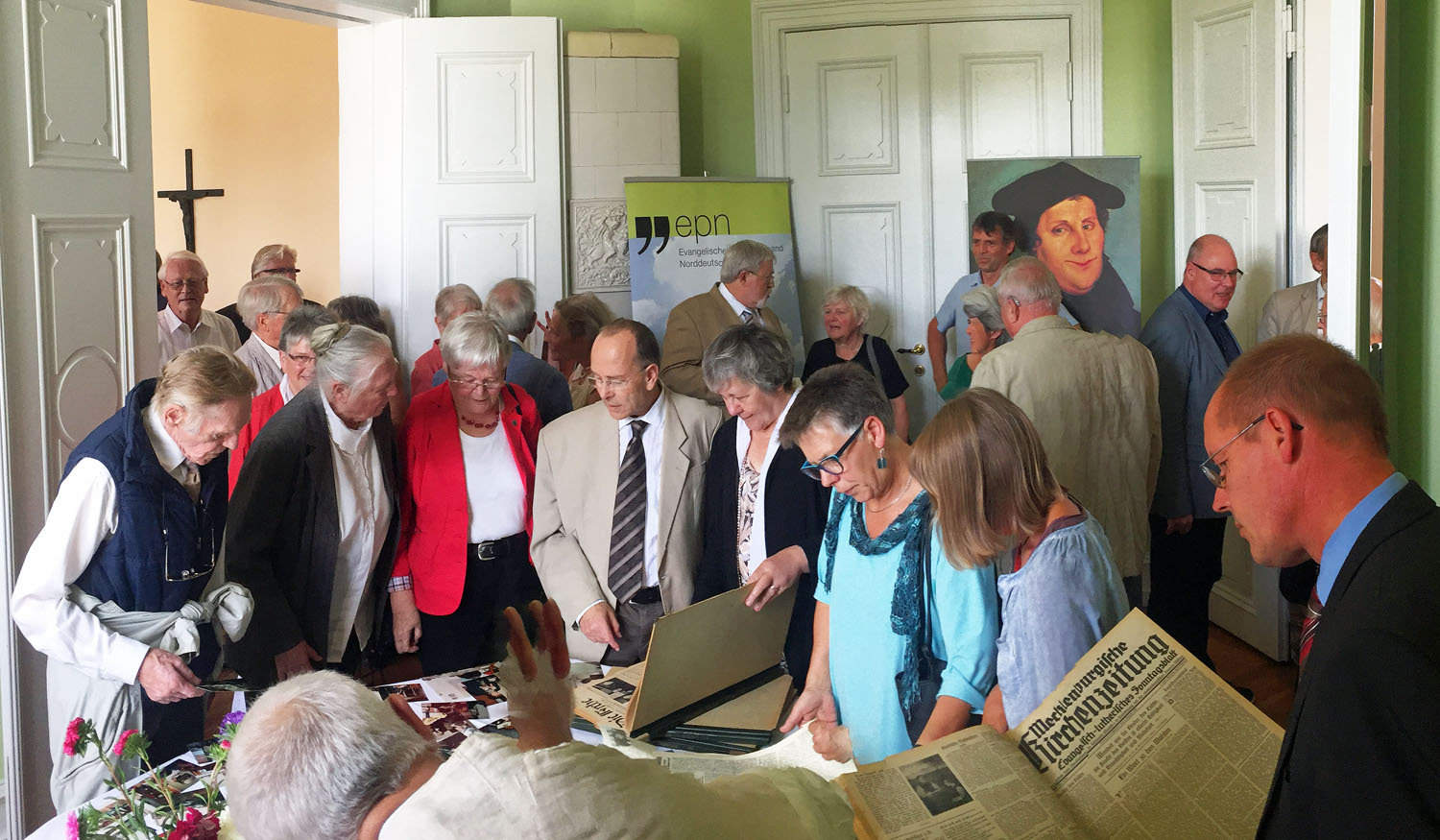 Über 100 Gäste, die meisten aus der Nordkirche, aber auch aus Berlin, Magdeburg und München waren gekommen. Im Festsaal des ehemaligen Oberkirchenrat wurden unzählige Hände geschüttelt, alte Fotos belächelt, vergilbte Zeitungen durchgeblättert. Ein Familientreffen der Mitstreiter, warmes Erinnern an gelebte Zeit. „Dass es mal soweit kommen würde, hätte ich mir vor über 30 Jahren in der kleinen Pressebaracke auf dem Hof hier nicht träumen lassen“, sagte Marion Wulf-Nixdorf bei der Begrüßung – die Älteste im Redaktionskreis: „Fast die Hälfte der 70 Jahre Kirchenzeitung kann ich überblicken.“ 40 Jahre bis in die 1990er wurde von der Baracke aus Zeitung gemacht, im Winter war es oft „saukalt“, sagte sie, wenn der Heizer wieder zuviel getrunken hatte.