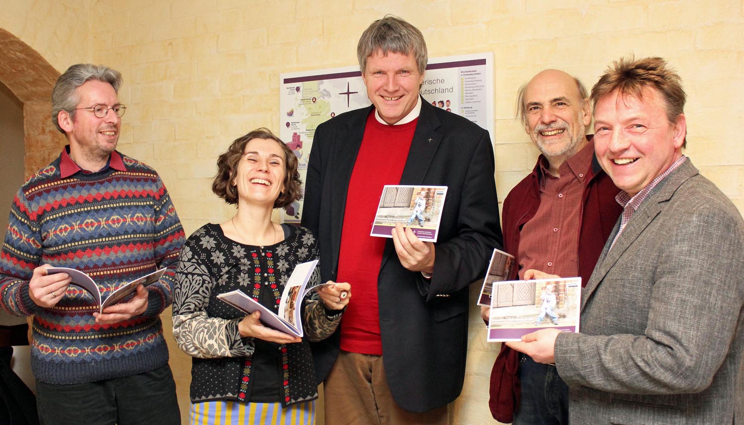 Empfehlen die Arbeitshilfe „Kinderleicht! Gottesdienst für alle.“ Kirchengemeinden als Impuls: Diakon Arne Bölt, Pastorin Sindy Altenburg, Bischof Dr. Andreas v. Maltzahn, Theologe und Pädagoge Jochem Westhof und Referent Stephan Rodegro (v.l.)