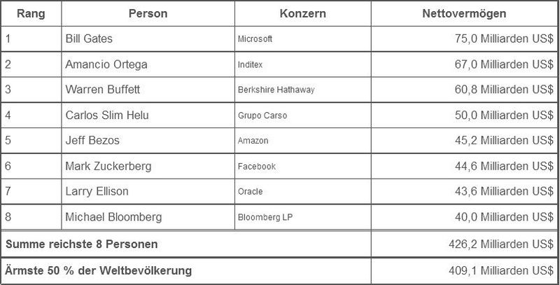 Die acht reichsten Männer der Welt besaßen der Studie zufolge 2016 zusammen 426 Milliarden US-Dollar (400 Milliarden Euro). Die ärmere Hälfte der Weltbevölkerung, 3,6 Milliarden Menschen, kam auf insgesamt 409 Milliarden Dollar (384 Milliarden Euro). Oxfam beruft sich auf Daten des Finanzkonzerns Credit Suisse und des US-Finanzmagazins "Forbes". Zu den reichsten Männern gehören Bill Gates, Warren Buffet, Carlos Slim und Mark Zuckerberg.
