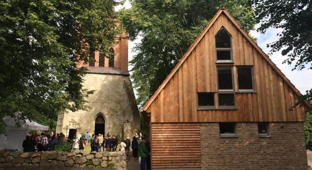 Seit knapp drei Jahrzehnten hatte es in Ranzin den Wunsch nach einem Gebäude gegeben, das die kleine Kirche künftig besser kulturell nutzbar machen und insbesondere für die Familien zur Verfügung stehen sollte. Schließlich entschloss man sich, das alte Wirtschaftsgebäude an der südwestlichen Friedhofsseite weitreichend umzubauen. Die alten Steine wurden für den Neubau wieder verwendet. Dr. Ulf Harder, Pastor der Kirchengemeinde im Seelsorgebereich Züssow-Ranzin, erzählt: „Uns gefällt besonders, dass das neue Gebäude Elemente des alten aufgreift, dabei aber neue Akzente setzt. Dem Architekten Klaus Berge ist eine schöne Verbindung von Vertrautem mit Neuem und Anregendem gelungen. Das ist gleichzeitig ein schönes Sinnbild für unser Konzept.“