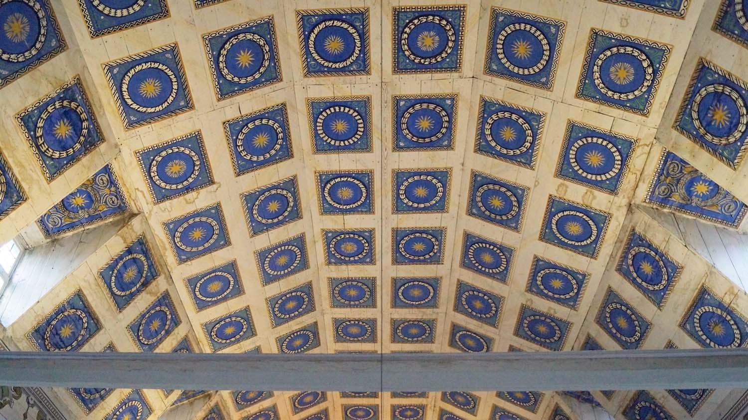 In die kleine Kirche in Benz passt ein ganzer Sternenhimmel. Zumindest im verkleinerten Maßstab. Wer das Gotteshaus auf der Insel Usedom betritt, schaut sofort nach oben und erblickt ein farbenprächtig ausgestaltetes Firmament. Hölzerne Kassettenfelder schmücken die Decke, die mit Sternen und Rosetten bemalt sind. Die faszinierenden Malereien wurden im Jahr 1909 vom Stettiner Hof-Dekorationsmaler Adolf Dittmer angefertigt. Die einzelnen Felder der Decke hat der Maler kunstvoll in immer wieder abgewandelten Details gestaltet. „In der pommerschen Metropole Stettin sind viele Arbeiten Adolf Dittmers verloren. In Benz ist noch ein Hauch des neubarocken kaiserzeitlichen Prunks spürbar, der in seiner Ausformung an Theaterdekorationen erinnert und den Chor zur Bühne werden lässt“, so das Urteil des Kunsthistorikers Detlef Witt.