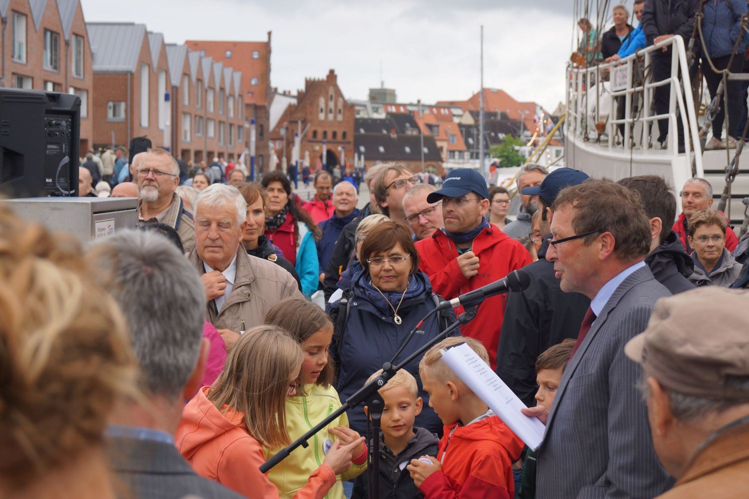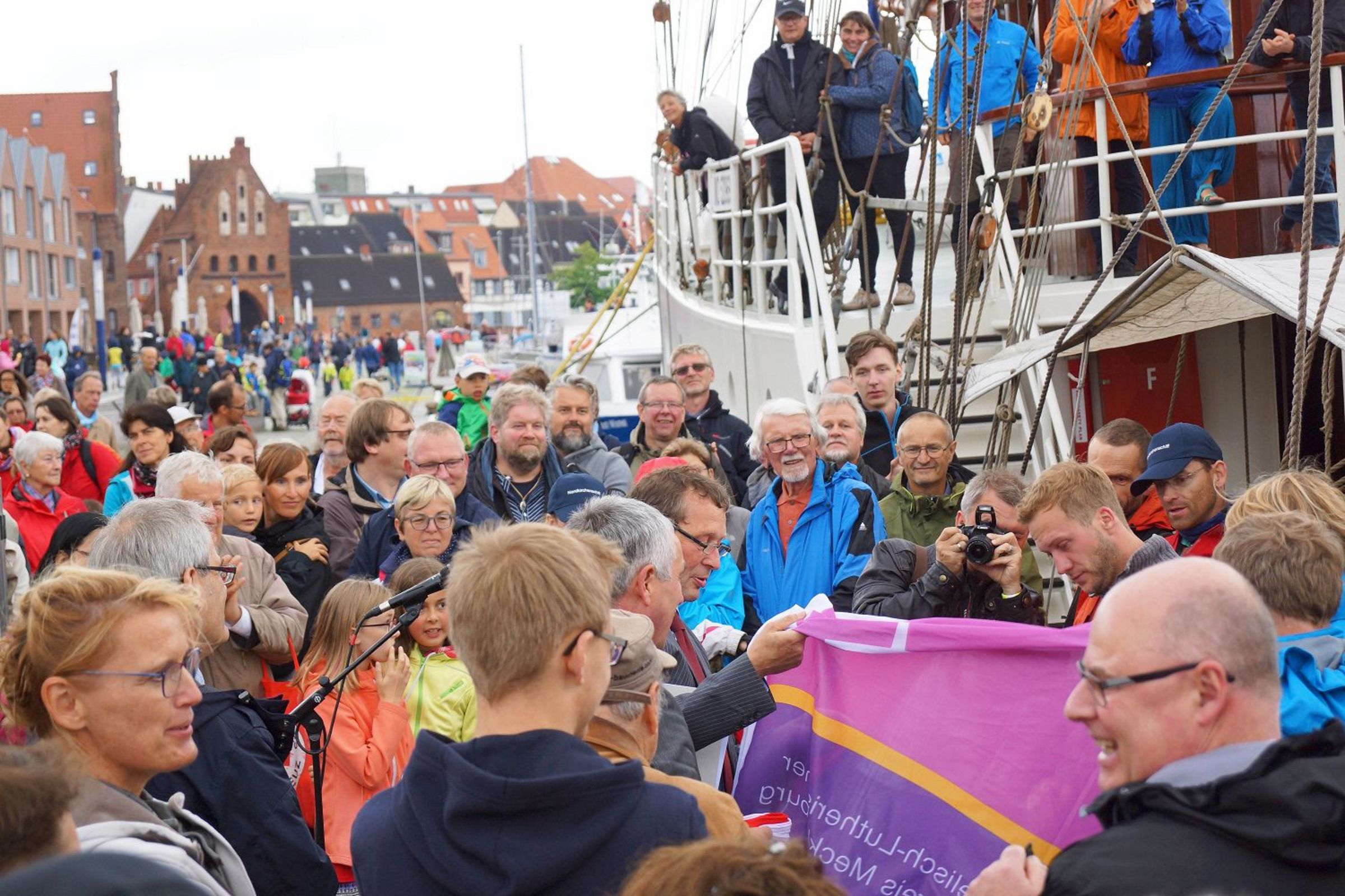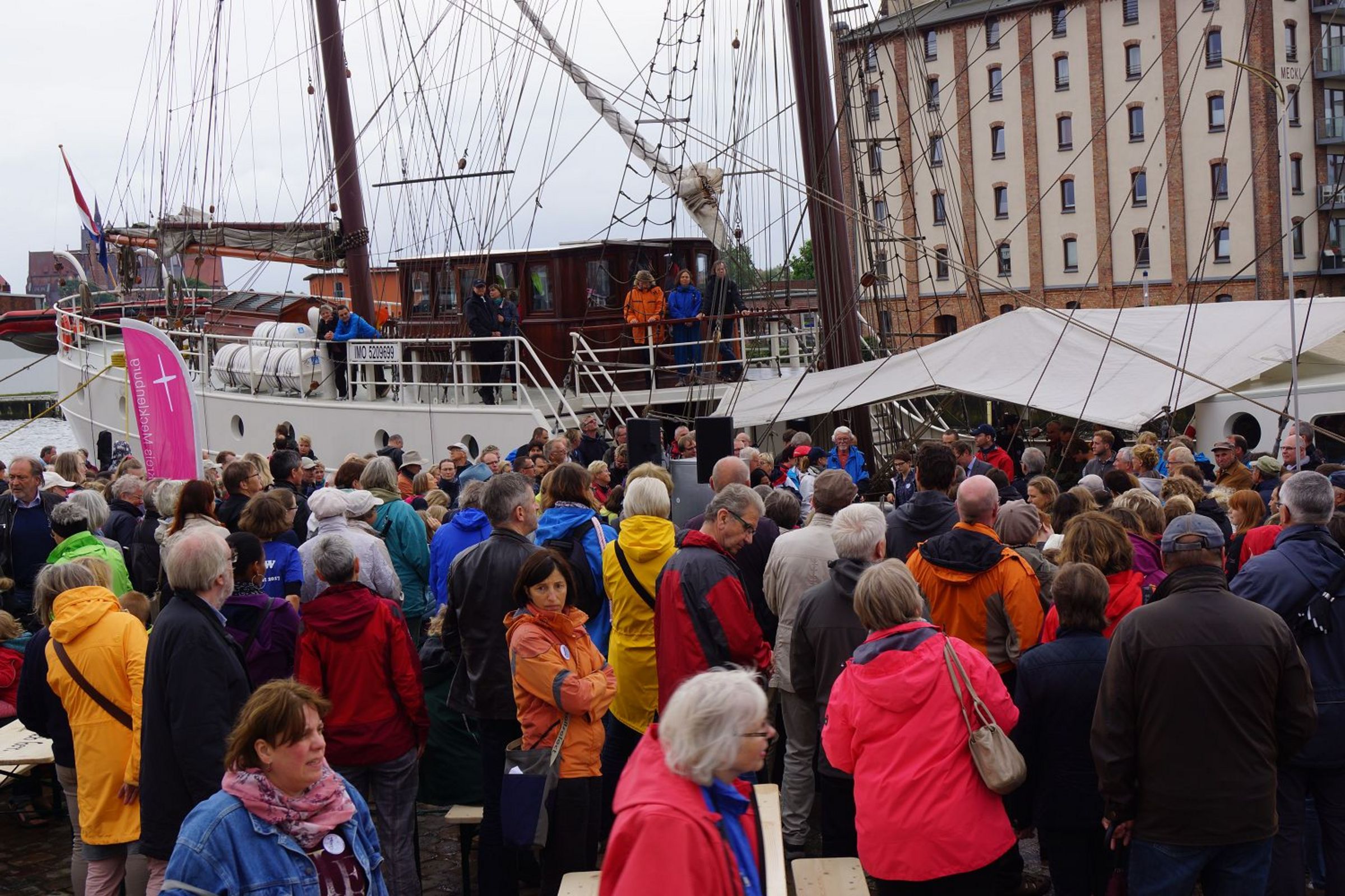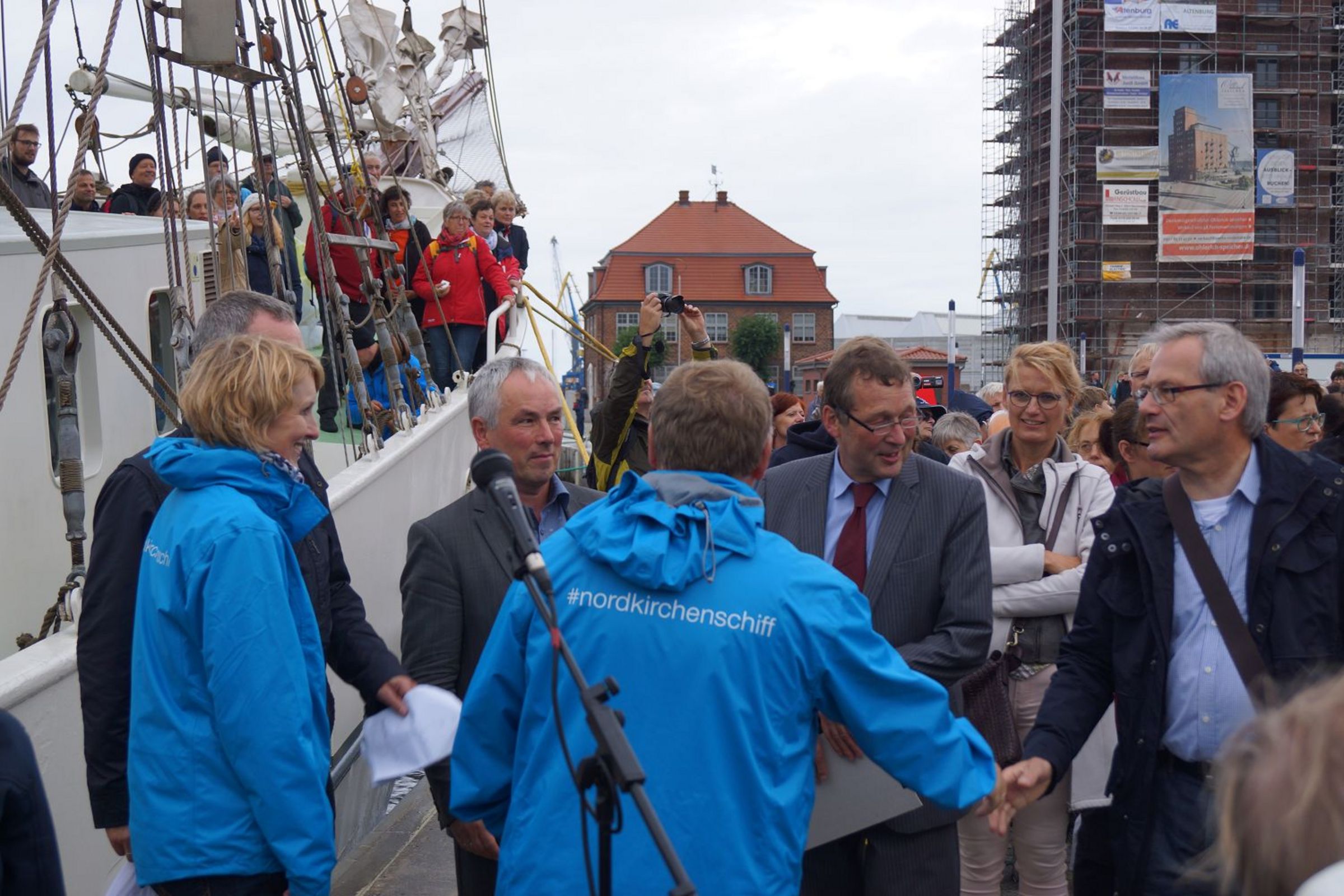 Bereits am Samstag wurde das Nordkirchenschiff mit einem großen Empfang in Wismar begrüßt. Hunderte Menschen verfolgten die Ankunft des 59 Meter langen Dreimast-Segler im Alten Hafen der Hansestadt. Pünktlich um 16 Uhr hießen Bürgermeister Thomas Beyer (Grußwort) und Propst Dr. Karl-Matthias Siegert umrahmt von einem Kinderchor das Schiff willkommen. Viele Gäste nutzten die Möglichkeit an Bord zu gehen. Zur Bläser-Andacht mit Landesposaunenwart Martin Huß und Propst Dirk Sauermann zeigte sich dann sogar noch die Sonne.