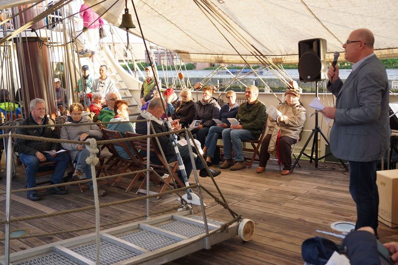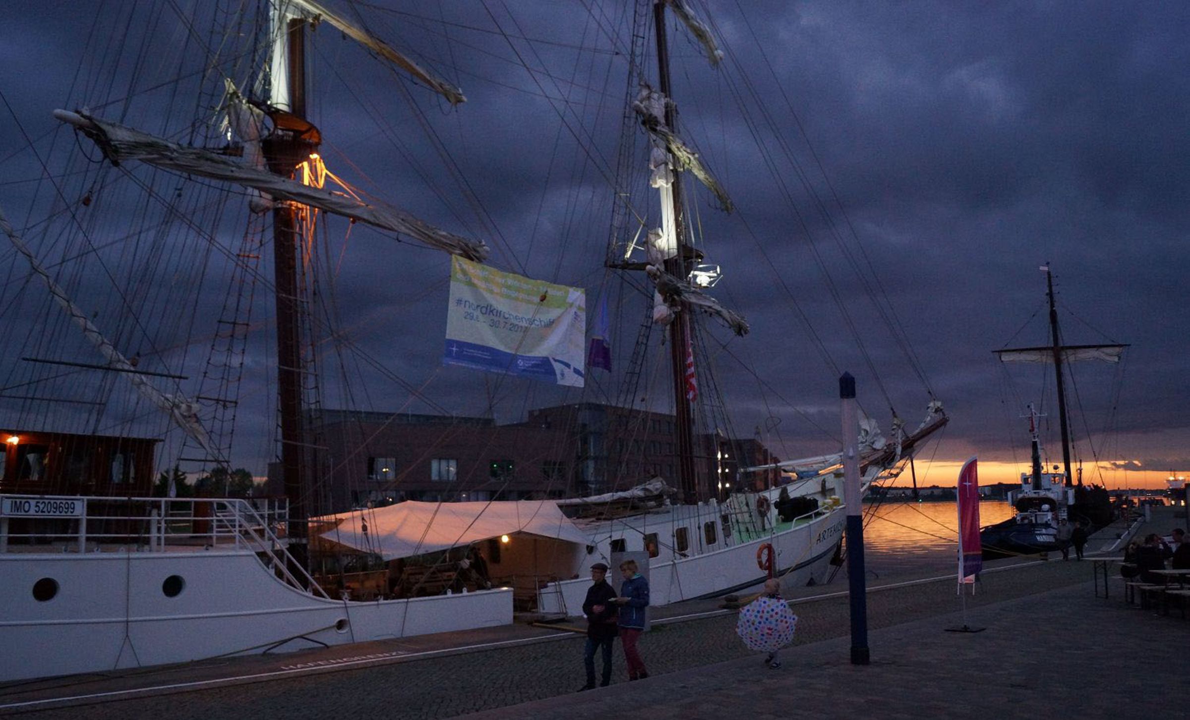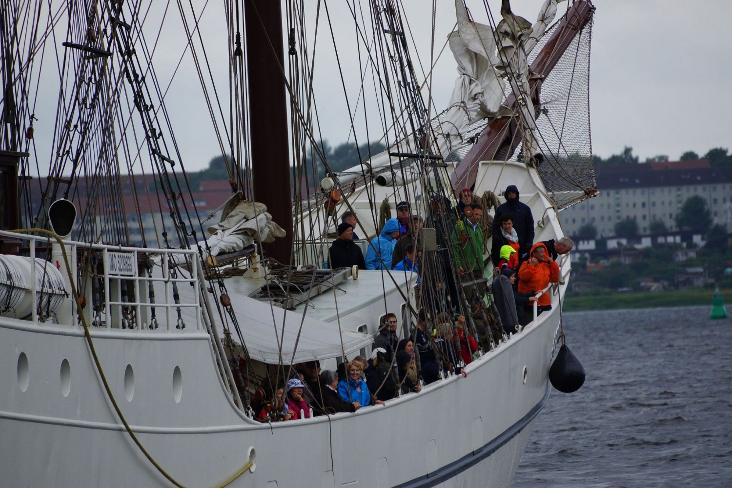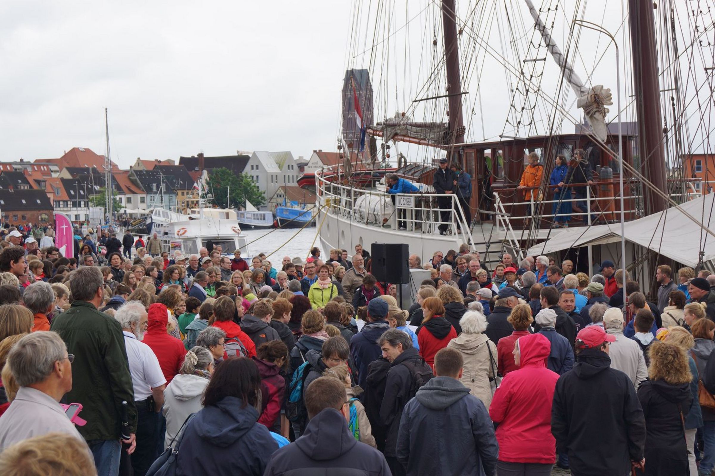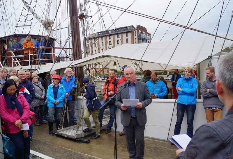Bereits am Samstag wurde das Nordkirchenschiff mit einem großen Empfang in Wismar begrüßt. Hunderte Menschen verfolgten die Ankunft des 59 Meter langen Dreimast-Segler im Alten Hafen der Hansestadt. Pünktlich um 16 Uhr hießen Bürgermeister Thomas Beyer (Grußwort) und Propst Dr. Karl-Matthias Siegert umrahmt von einem Kinderchor das Schiff willkommen. Viele Gäste nutzten die Möglichkeit an Bord zu gehen. Zur Bläser-Andacht mit Landesposaunenwart Martin Huß und Propst Dirk Sauermann zeigte sich dann sogar noch die Sonne.