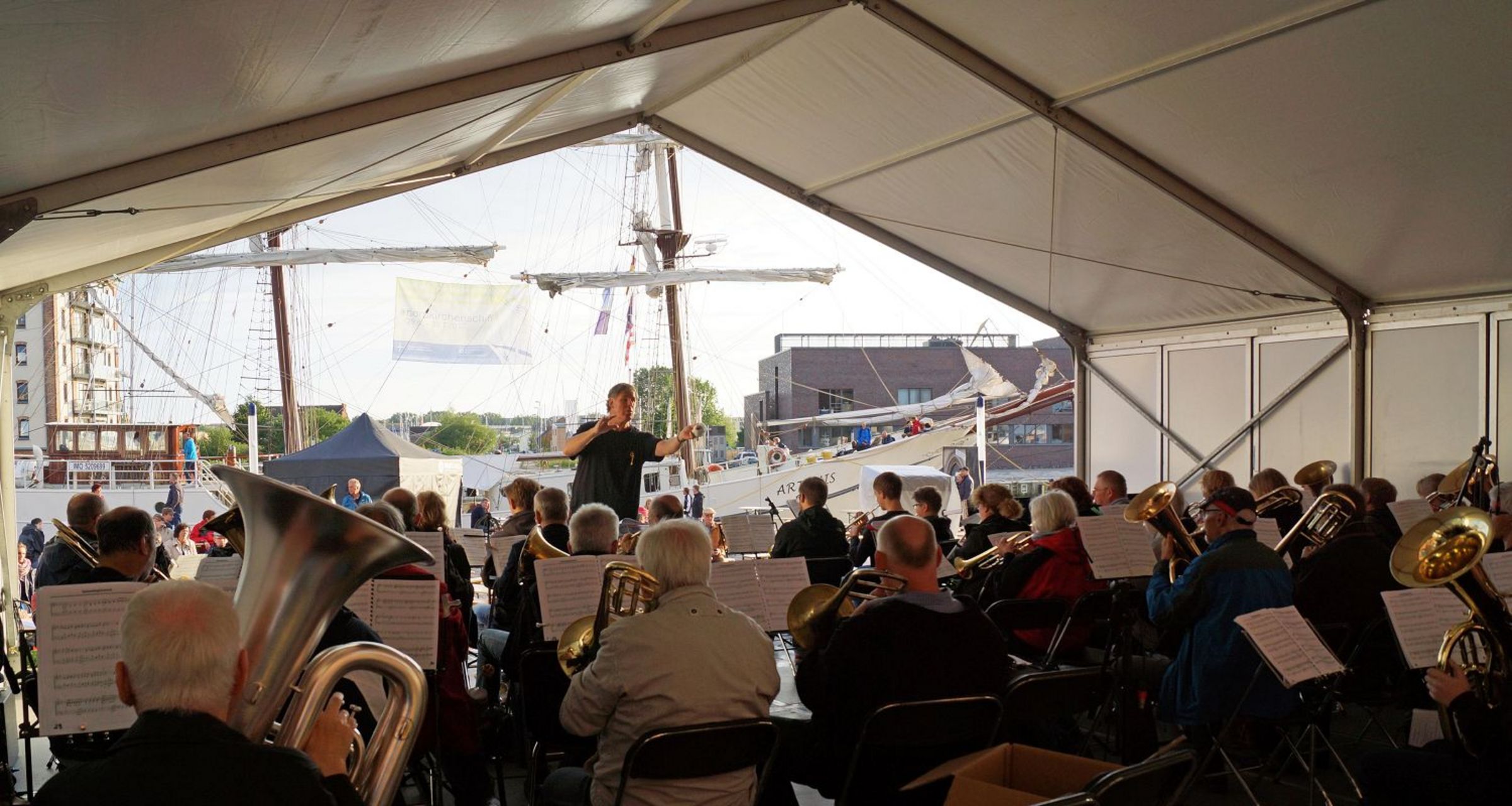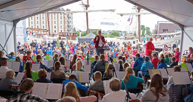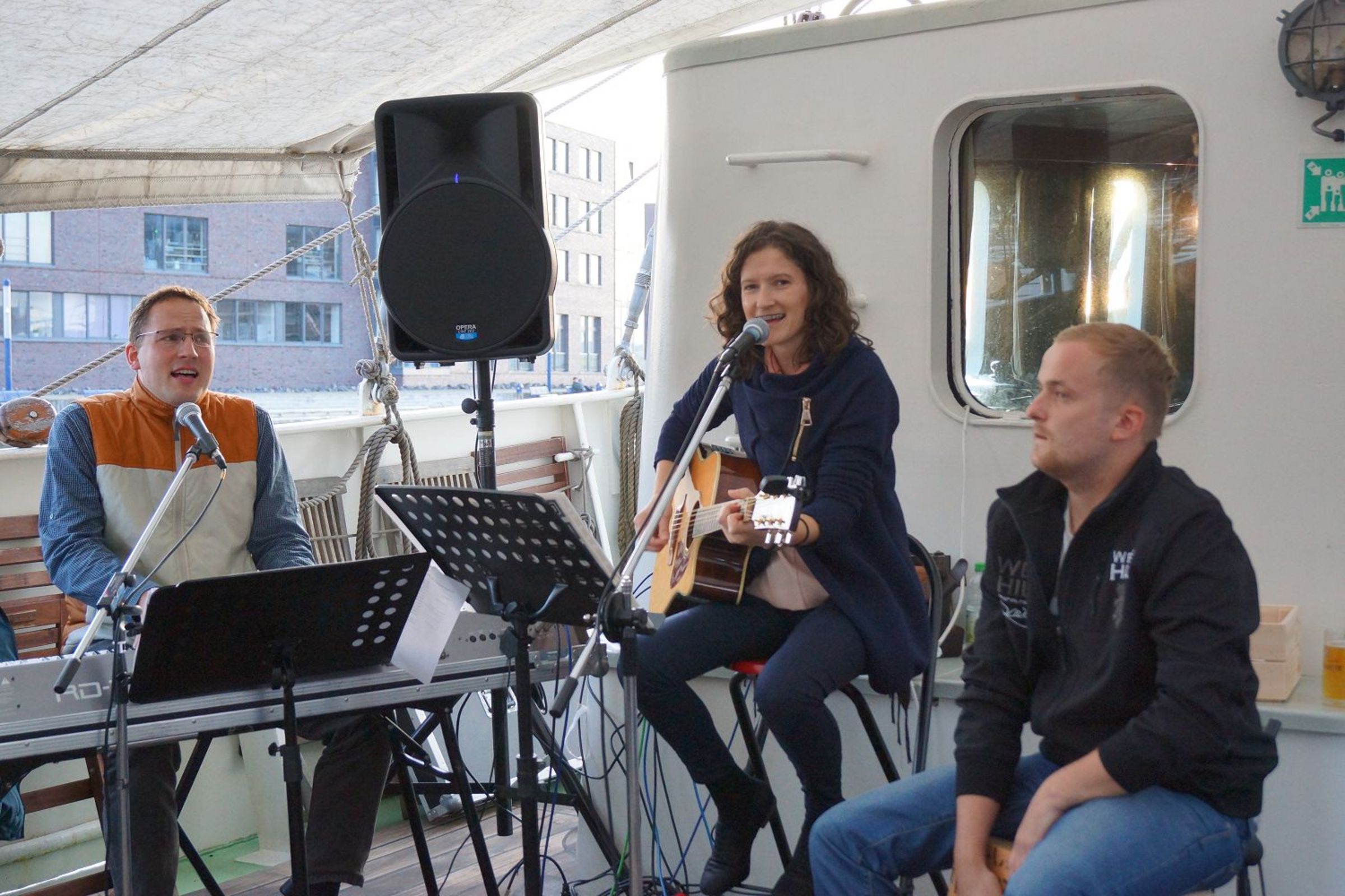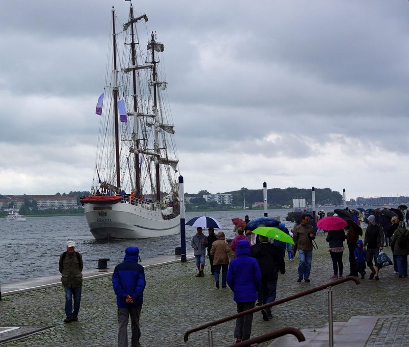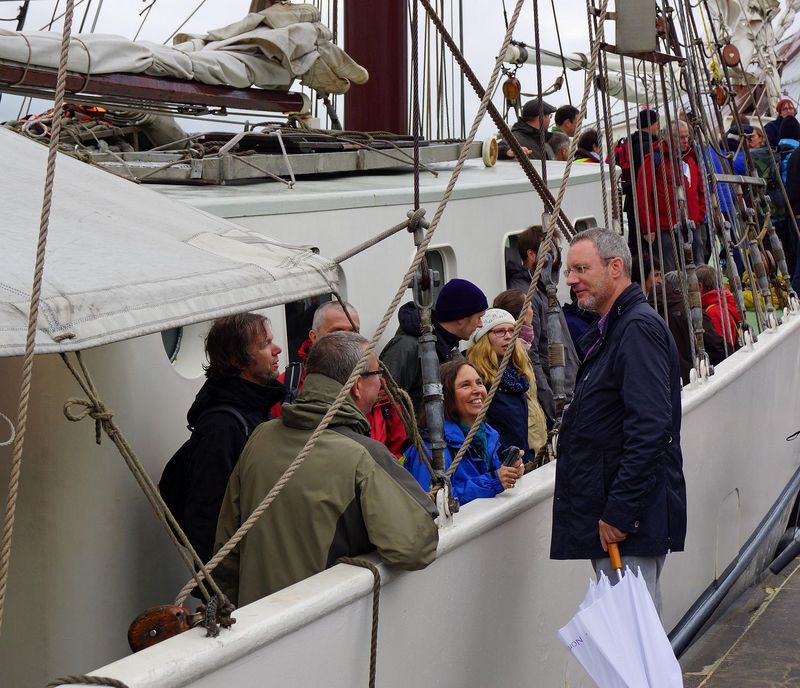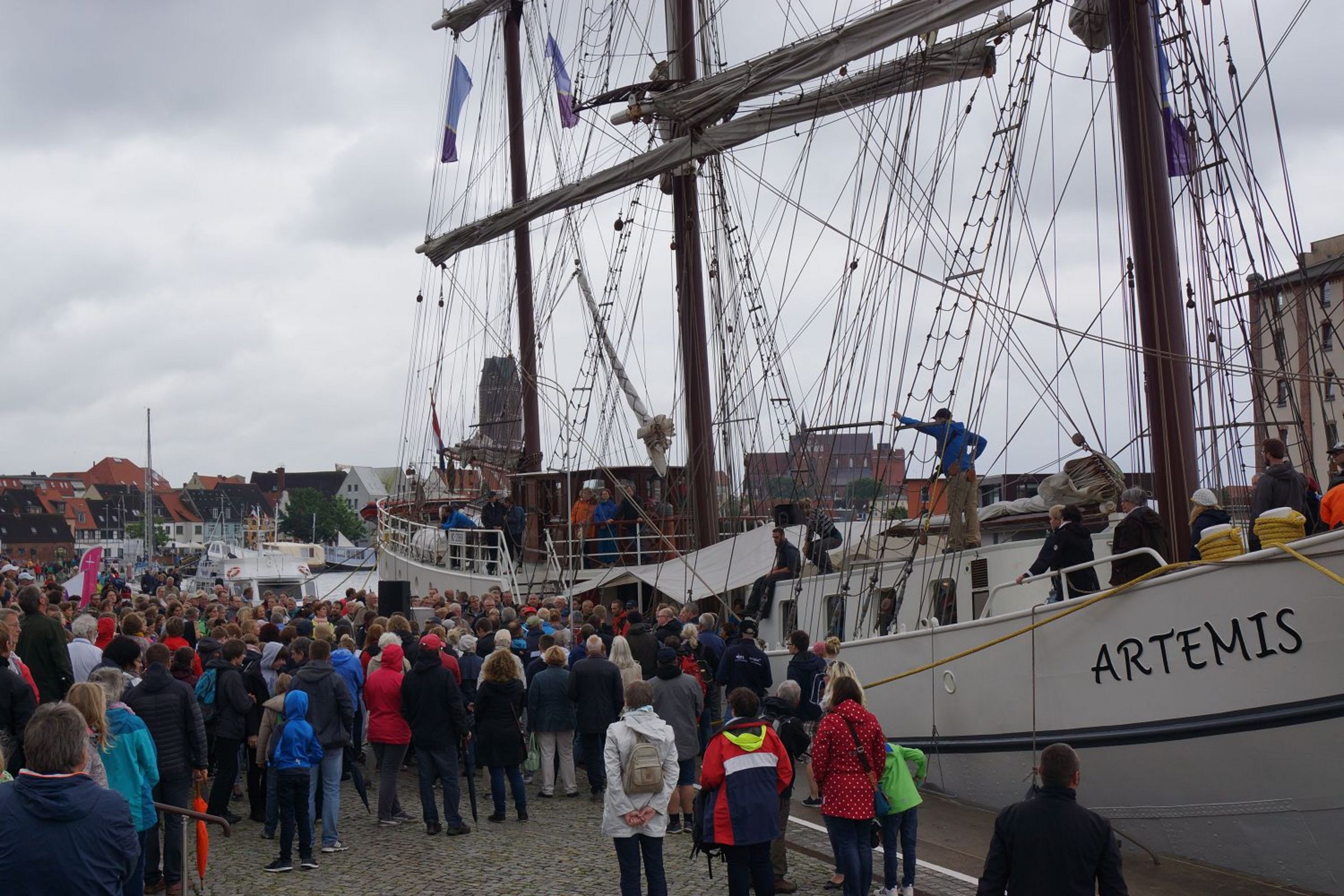 Bereits am Samstag wurde das Nordkirchenschiff mit einem großen Empfang in Wismar begrüßt. Hunderte Menschen verfolgten die Ankunft des 59 Meter langen Dreimast-Segler im Alten Hafen der Hansestadt. Pünktlich um 16 Uhr hießen Bürgermeister Thomas Beyer (Grußwort) und Propst Dr. Karl-Matthias Siegert umrahmt von einem Kinderchor das Schiff willkommen. Viele Gäste nutzten die Möglichkeit an Bord zu gehen. Zur Bläser-Andacht mit Landesposaunenwart Martin Huß und Propst Dirk Sauermann zeigte sich dann sogar noch die Sonne.