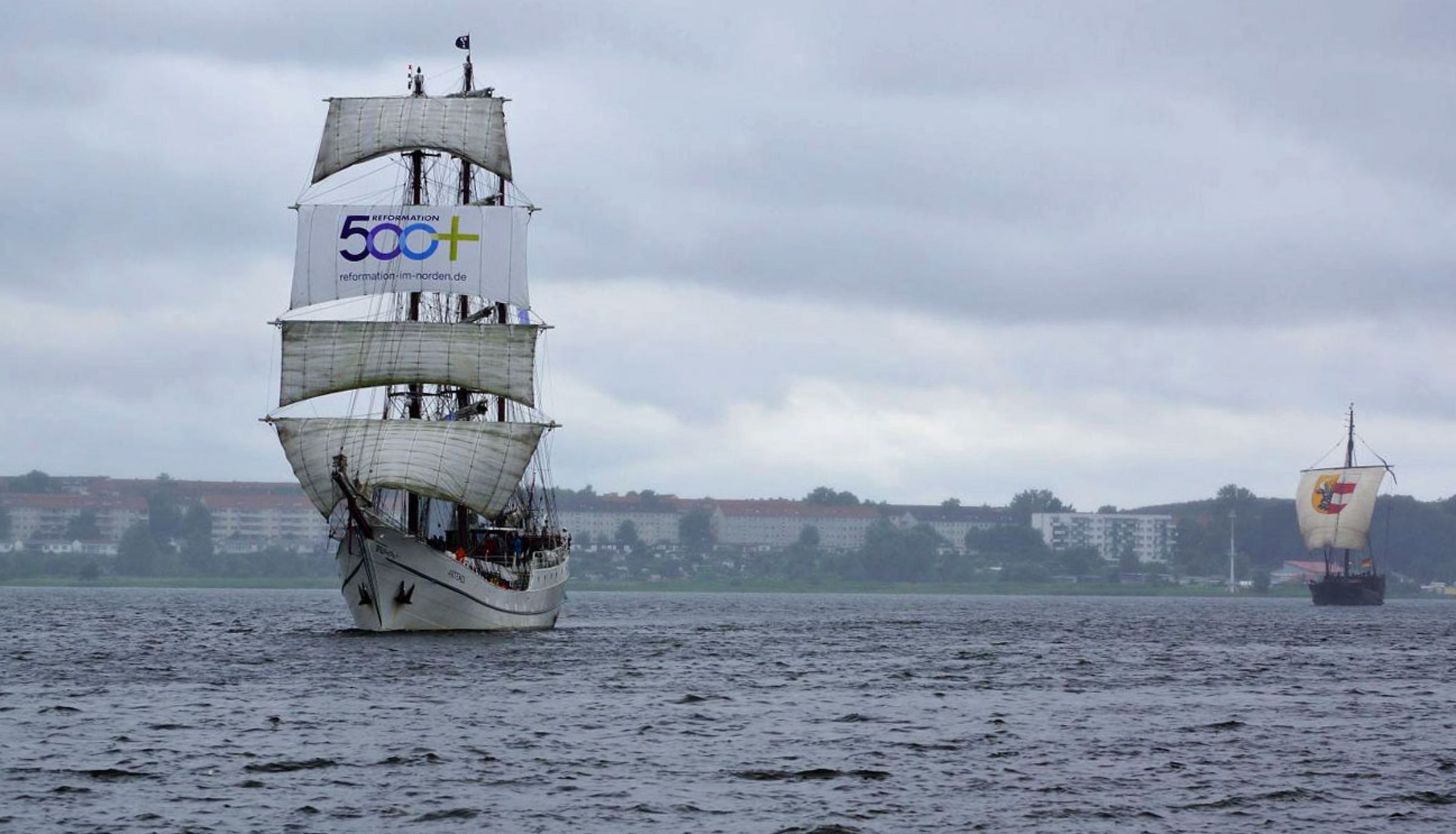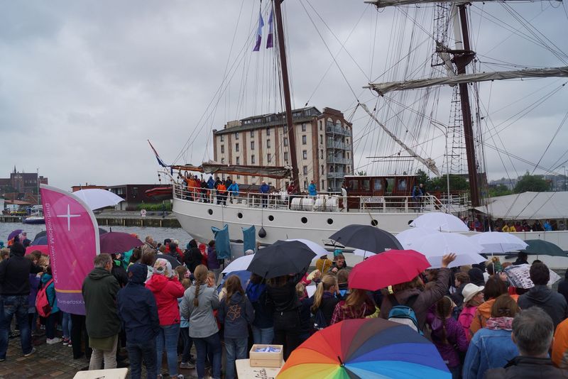 Das Nordkirchenschiff war am Donnerstag (29. Juni) in Stralsund zu seiner vierwöchigen Schiffstour rund um die Nordkirche aufgebrochen. Mit der Segeltour will die Nordkirche das Reformationsjubiläum 2017 feiern. Nach einem Zwischenstopp am Freitag in Warnemünde war Wismar am Wochenende die zweite Station. Weiter geht’s nach Lübeck, Neustadt, Laboe, Eckernförde, Sonderburg, Flensburg, Kiel, Helgoland, Husum, Büsum, Glückstadt und Hamburg. Die Nordkirche ist die einzige Landeskirche in Deutschland, in der alle zugehörigen Kirchenkreise auf dem Wasserweg erreichbar sind. Auf 18 Streckenabschnitten werden insgesamt rund 1.500 Gäste an Bord mitreisen.