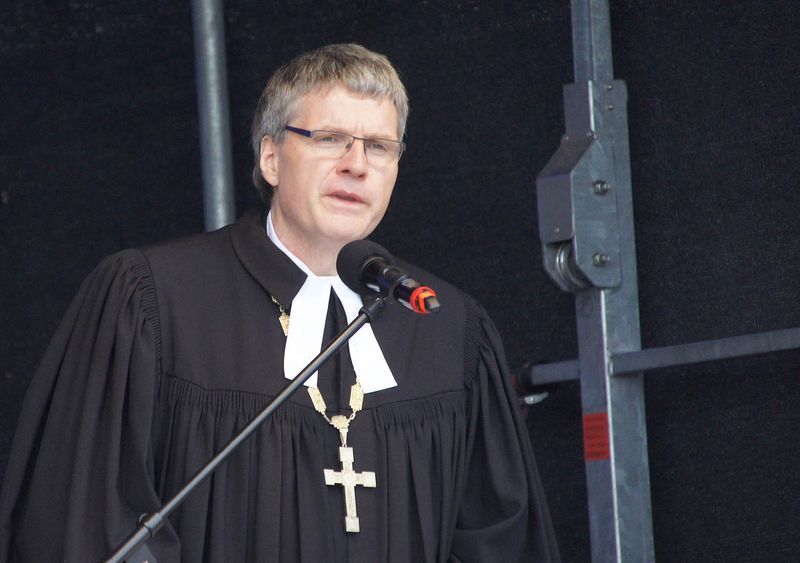 Nachdem es am Sonntagmorgen zunächst nach schönem Wetter aussah, mussten die Gottesdienstbesucher dann aber doch kurzzeitig ihre Regenschirme aufspannen. In seiner Predigt ermutigte Bischof Dr. Andreas von Maltzahn, sich nicht von Ängsten lähmen zu lassen und sich einzumischen, damit die gesellschaftlichen Verhältnisse nicht bleiben, wie sie sind. "Das Vertrauen zu Gott ist stärker als die Angst. Das trägt auch in diesen Zeiten", so der Schweriner Bischof.