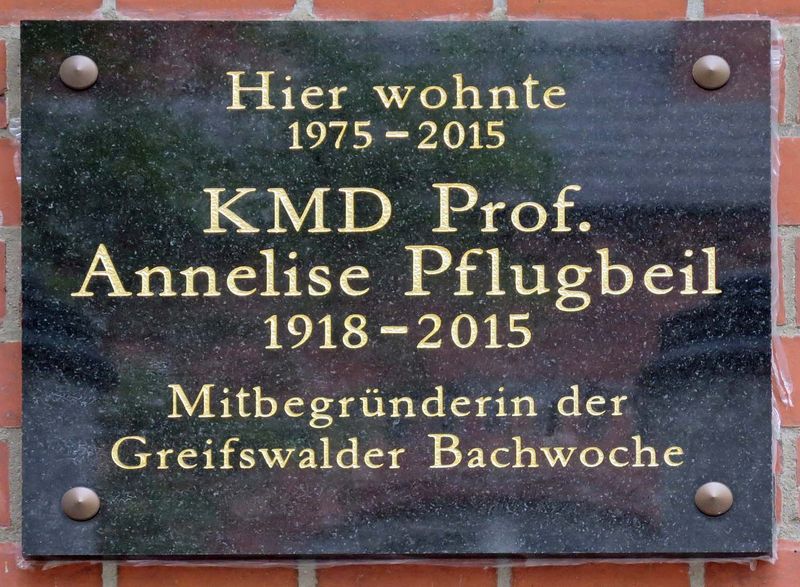Bereits am Samstag wurde am Lutherhof in der Martin-Luther-Straße 8 eine Gedenktafel für die Mitbegründerin der Greifswalder Bachwoche, Annelise Pflugbeil (1918-2015), enthüllt. 40 Jahre lebte Annelise Pflugbeil im Wohngebäude des Lutherhofs. Dort hatte sie nach ihrer Flucht aus Stettin im Jahre 1945 im früheren Verwaltungsamt Klavierunterricht geben können. Dort fand auch die schicksalhafte Begegnung mit ihrem späteren Mann, dem Kantor Hans Pflugbeil statt. Vor 71 Jahren begründeten sie die Greifswalder Bachwoche, die durch alle Jahrzehnte mit ihren Erfolgen, aber auch Repressionen durch den DDR-Staat bis heute weiterbesteht.